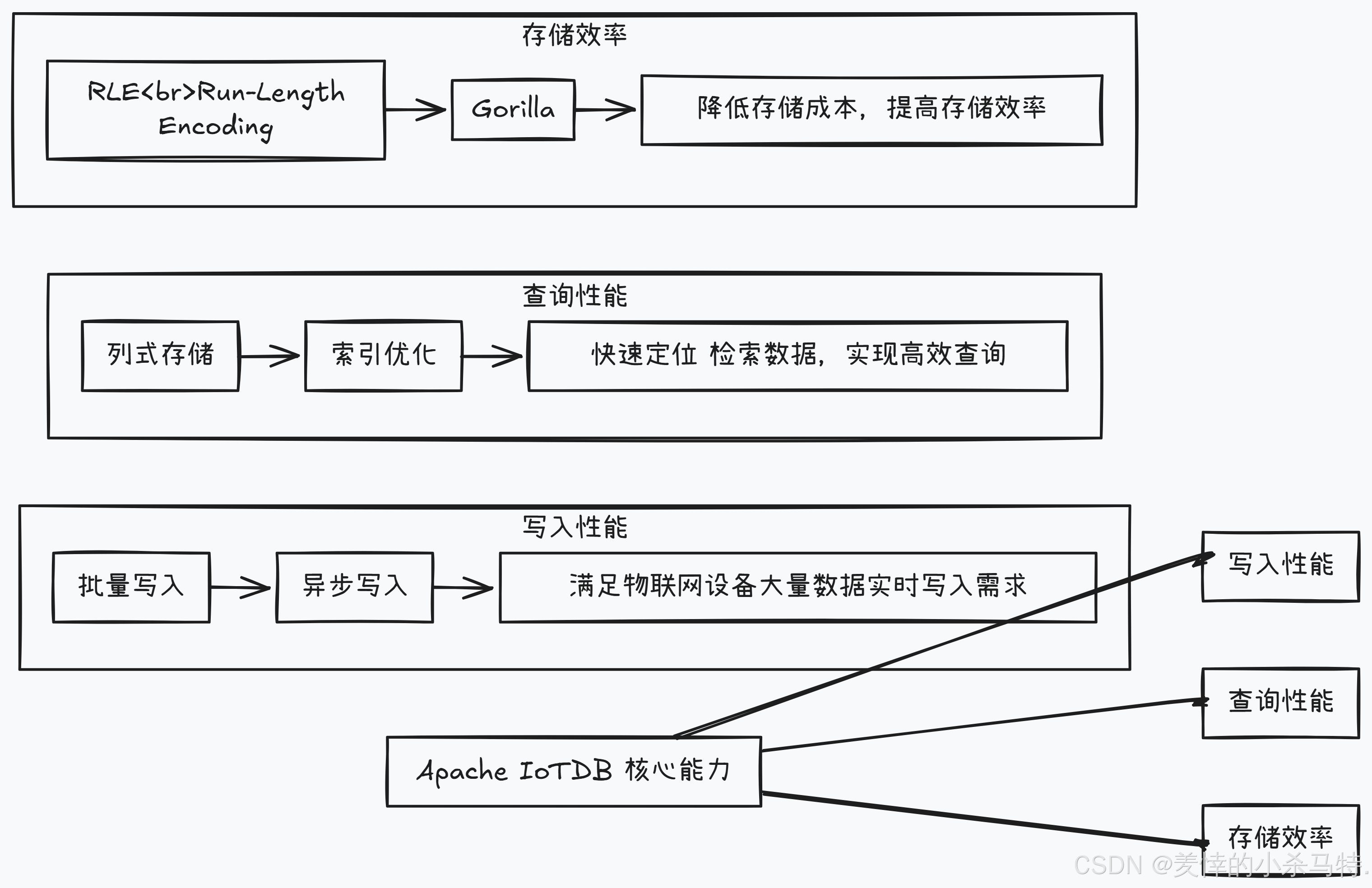 - 采用 轻量级文件格式(TsFile),优化了 IoT 数据的高频写入模式,避免传统数据库因频繁索引更新导致的性能瓶颈。