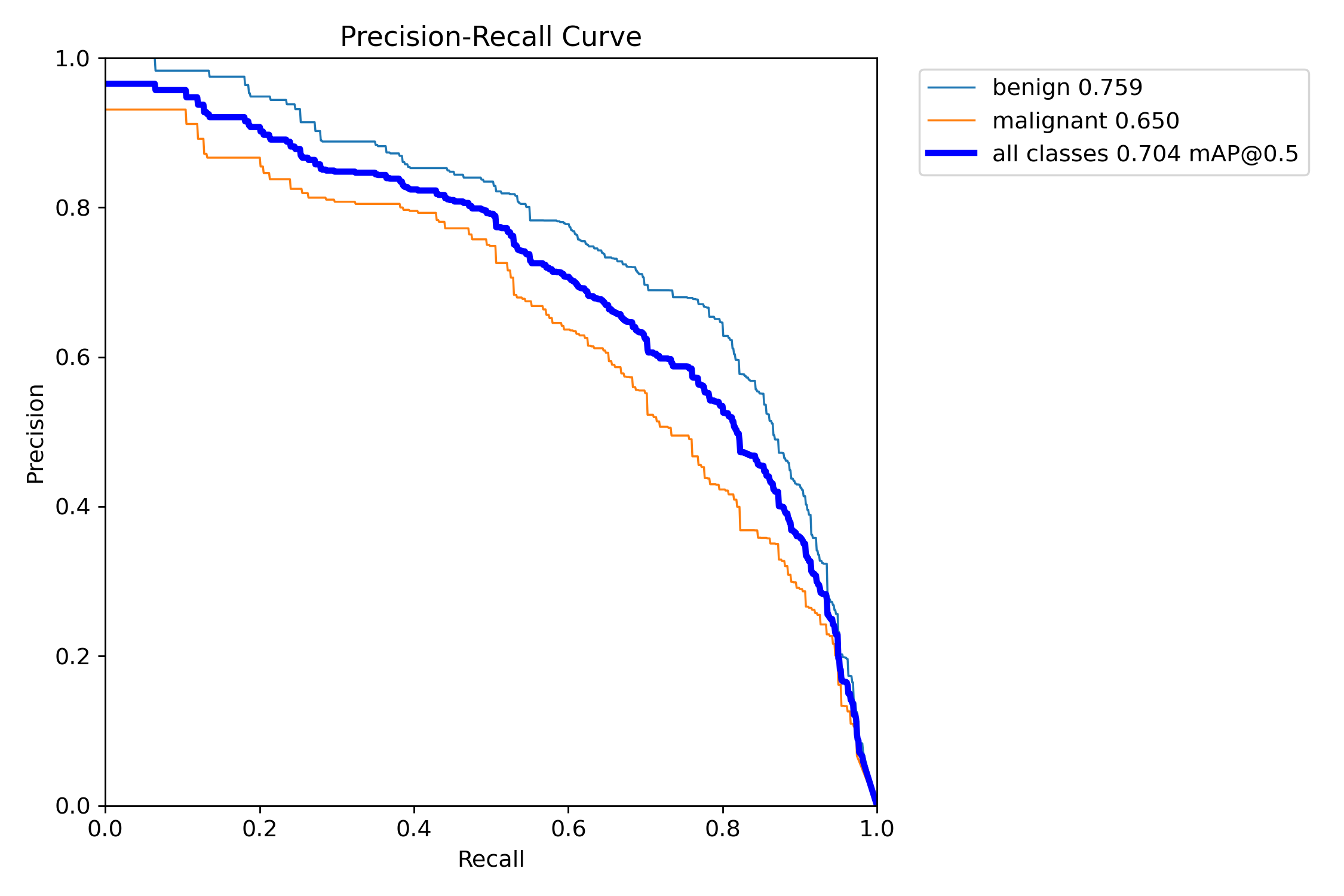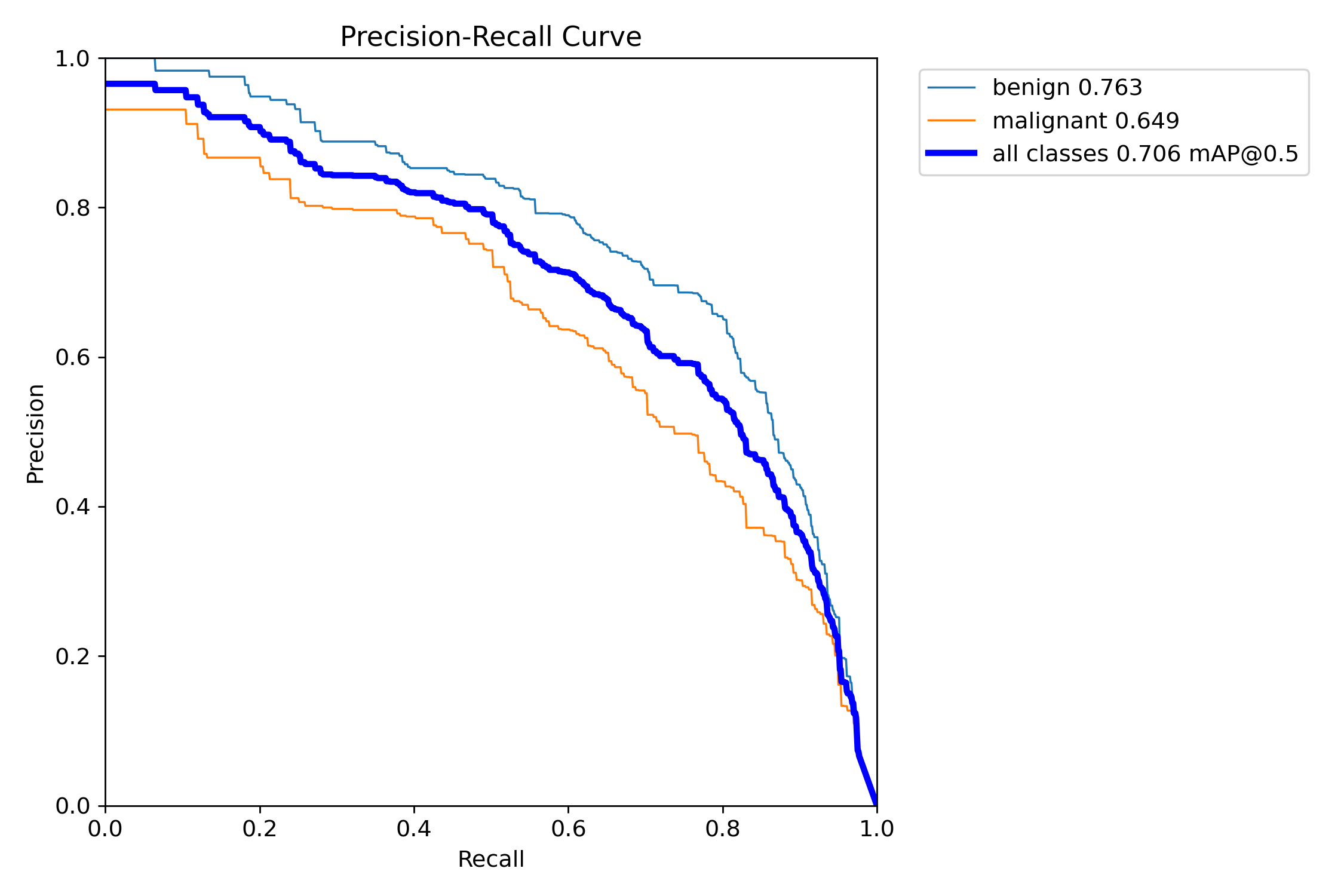来体现精确率和召回率的关系,本文训练结果的PR曲线如下。mAP