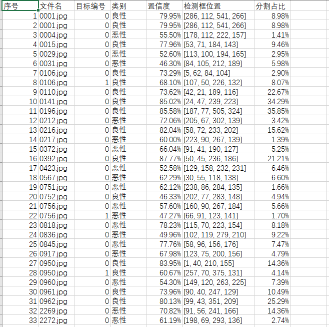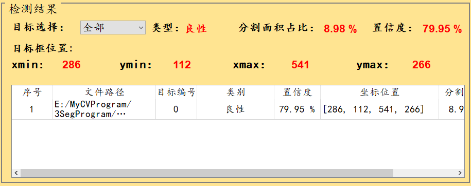 表格中包含图像中所有目标的检测相关结果,包含:路径、类别、置信度、目标位置、目标分割占比。