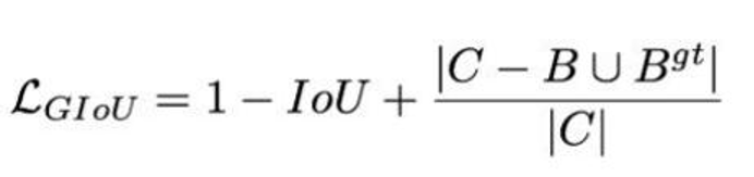 GIOU 损失 :引入 "最小封闭框 C",即使框不重叠,也能通过 C 与两框的面积差计算损失,让模型朝着 "靠近目标" 的方向优化。公式: