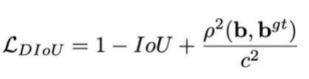 分子计算预测框与真实框的中心点欧式距离d,分母是能覆盖预测框与真实框的最小BOX的对角线长度c。