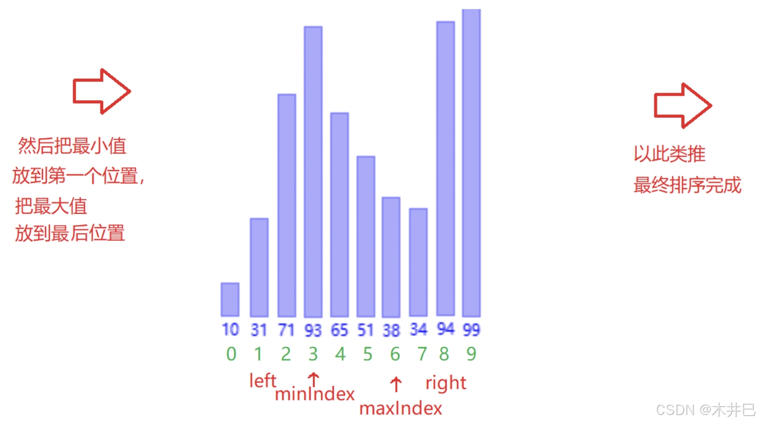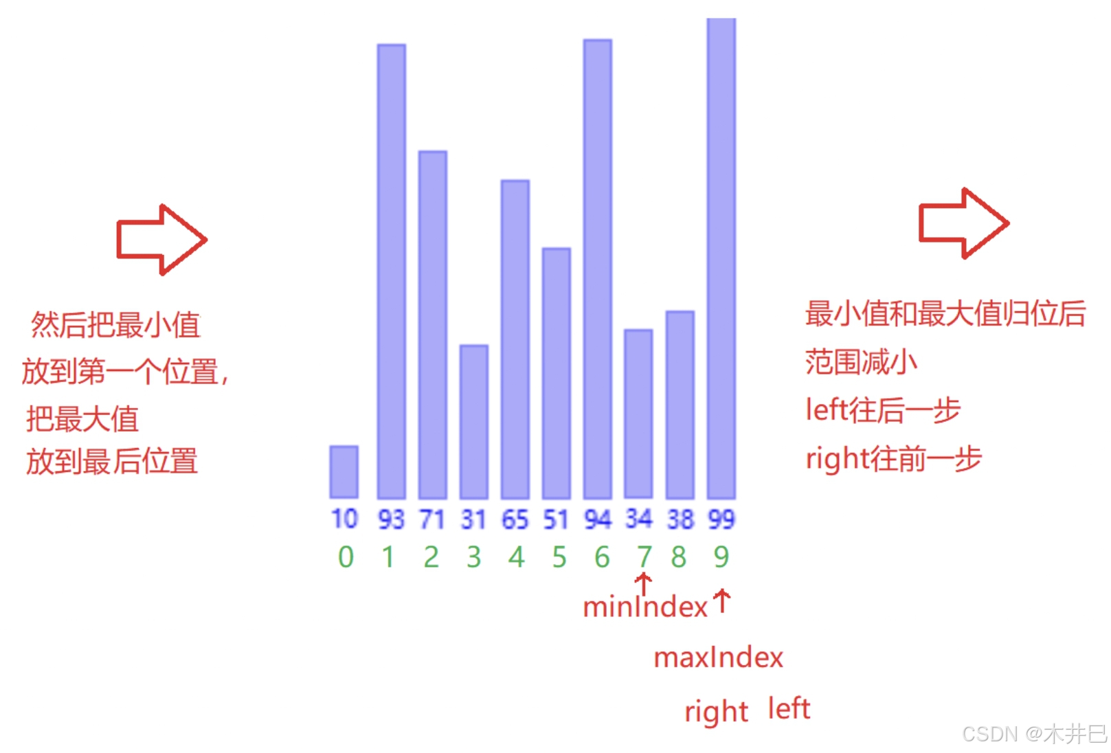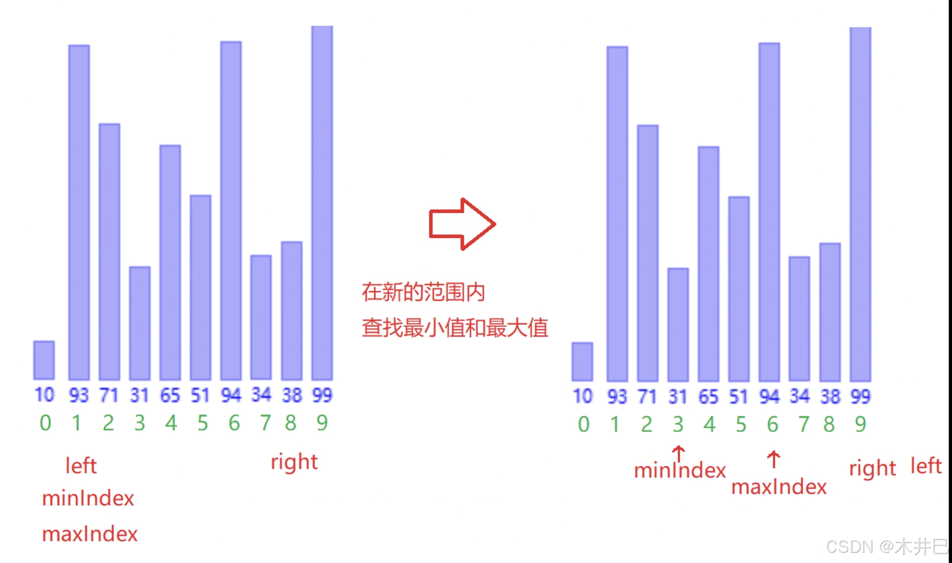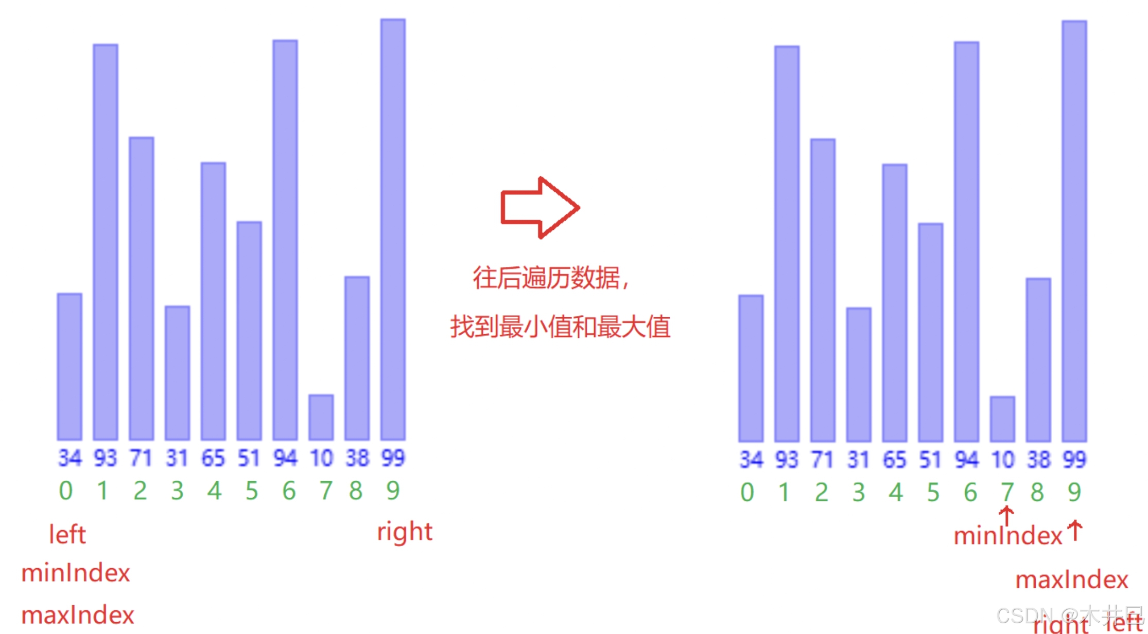 - 遍历数据,默认第一个元素(left所在位置的值)是最小值和最大值;往后遍历数据的同时找到数据中的最小值和最