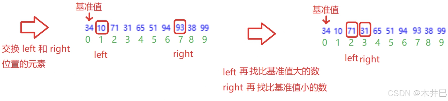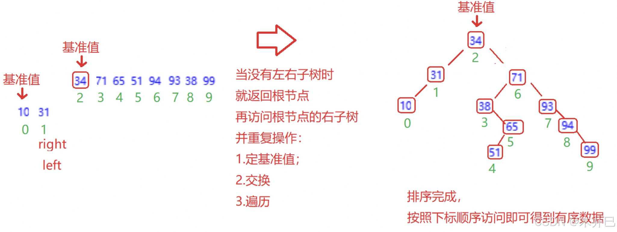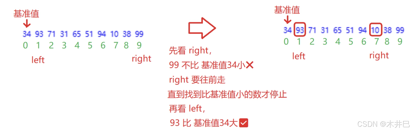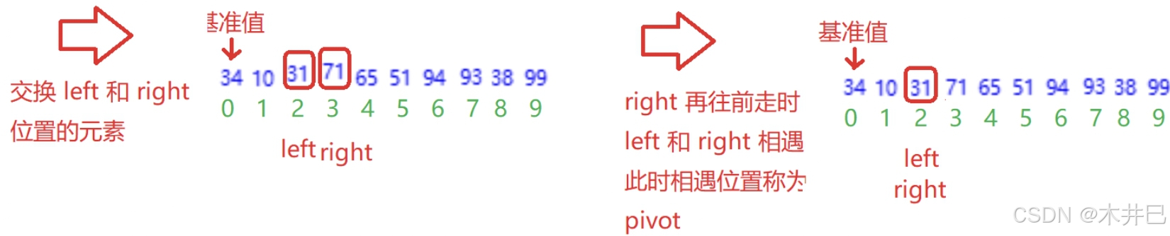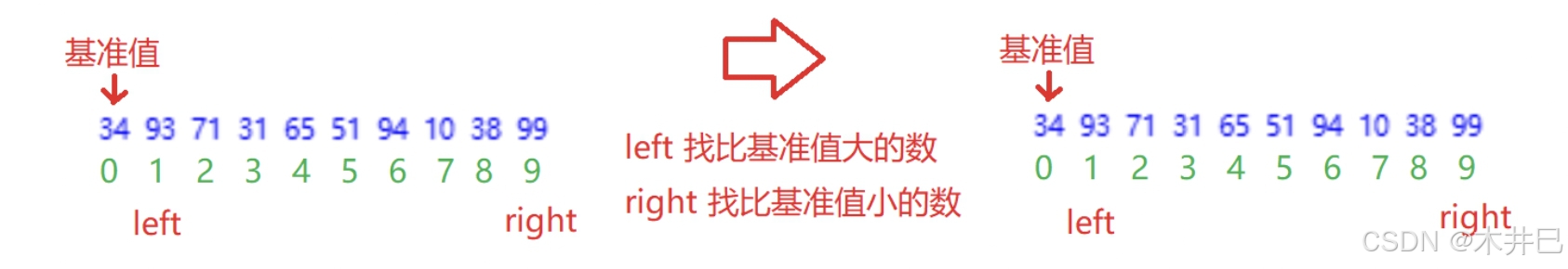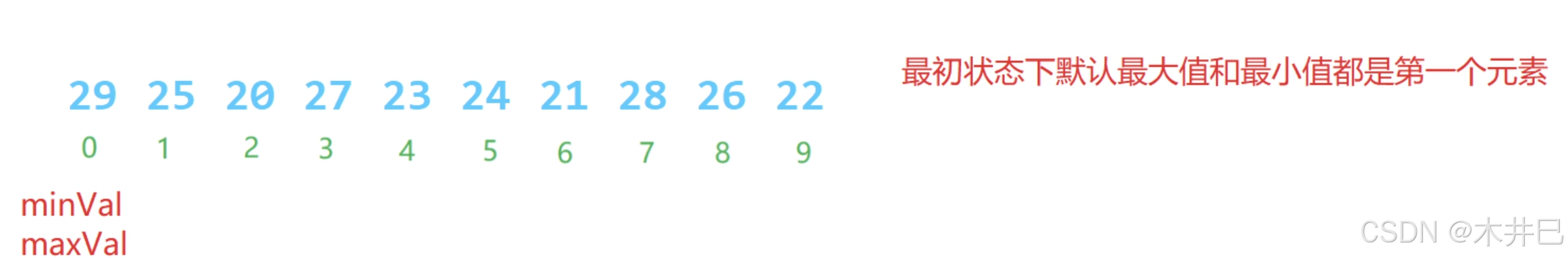 - 遍历数据,默认第一个元素(left所在位置的值)是最小值和最大值;往后遍历数据的同时找到数据中的最小值和最