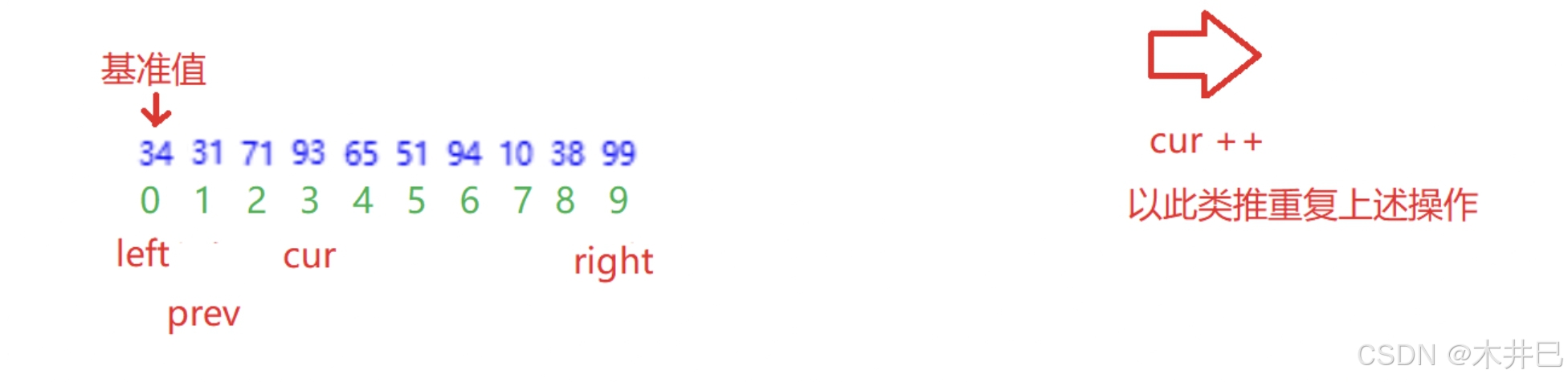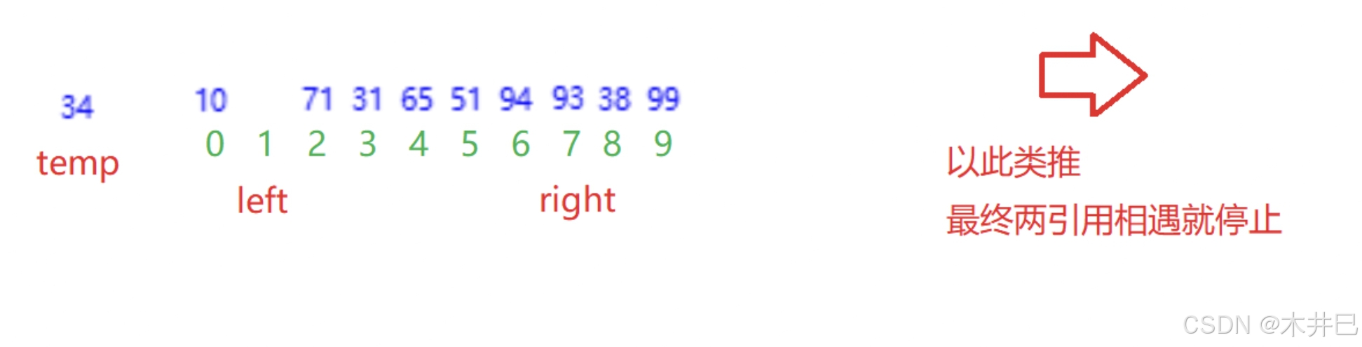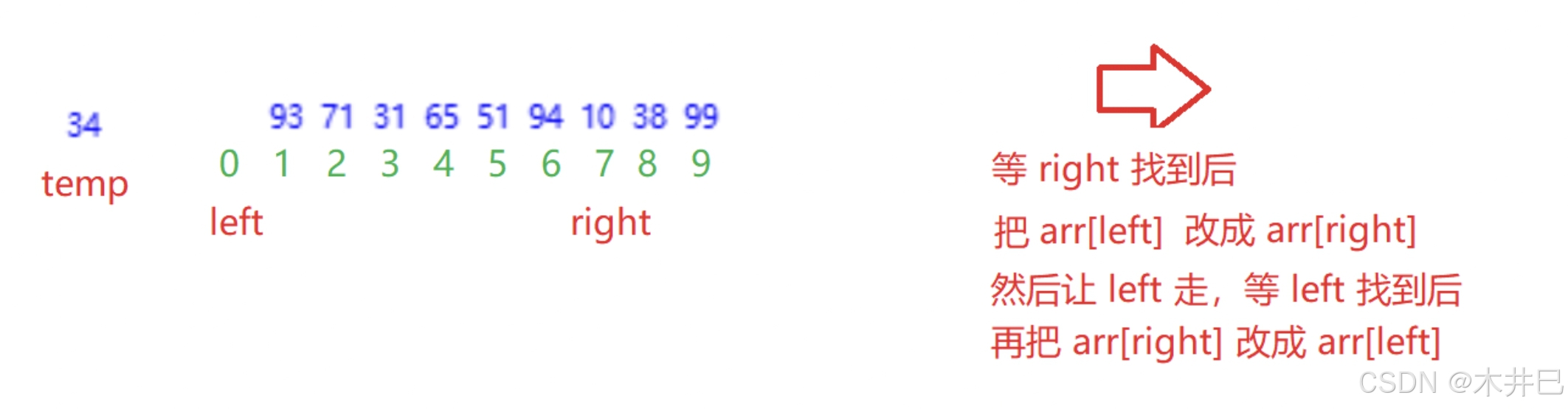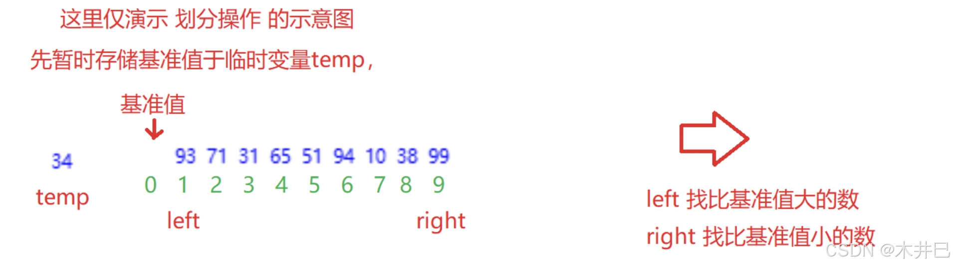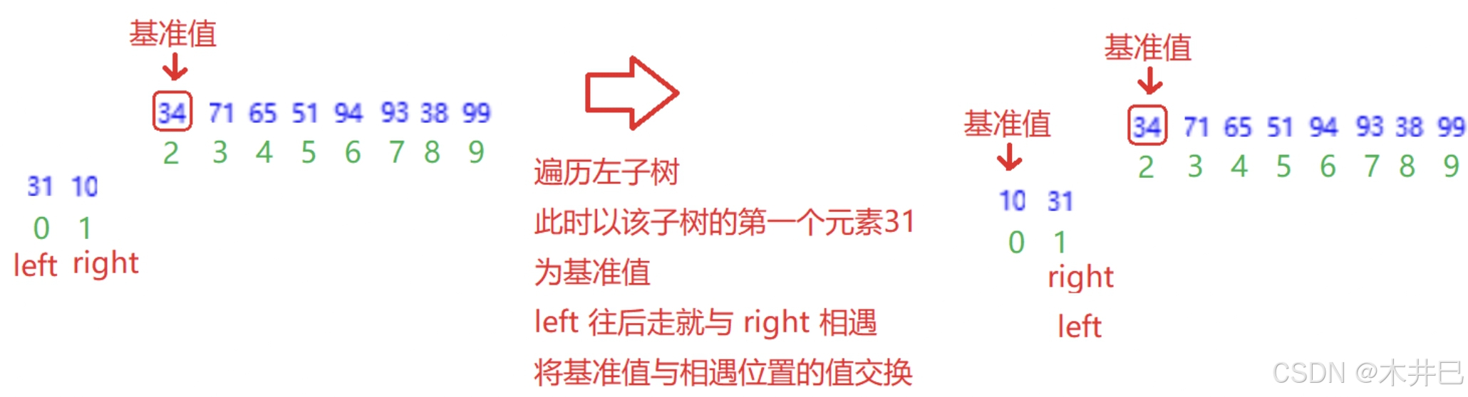 - 遍历数据,默认第一个元素(left所在位置的值)是最小值和最大值;往后遍历数据的同时找到数据中的最小值和最