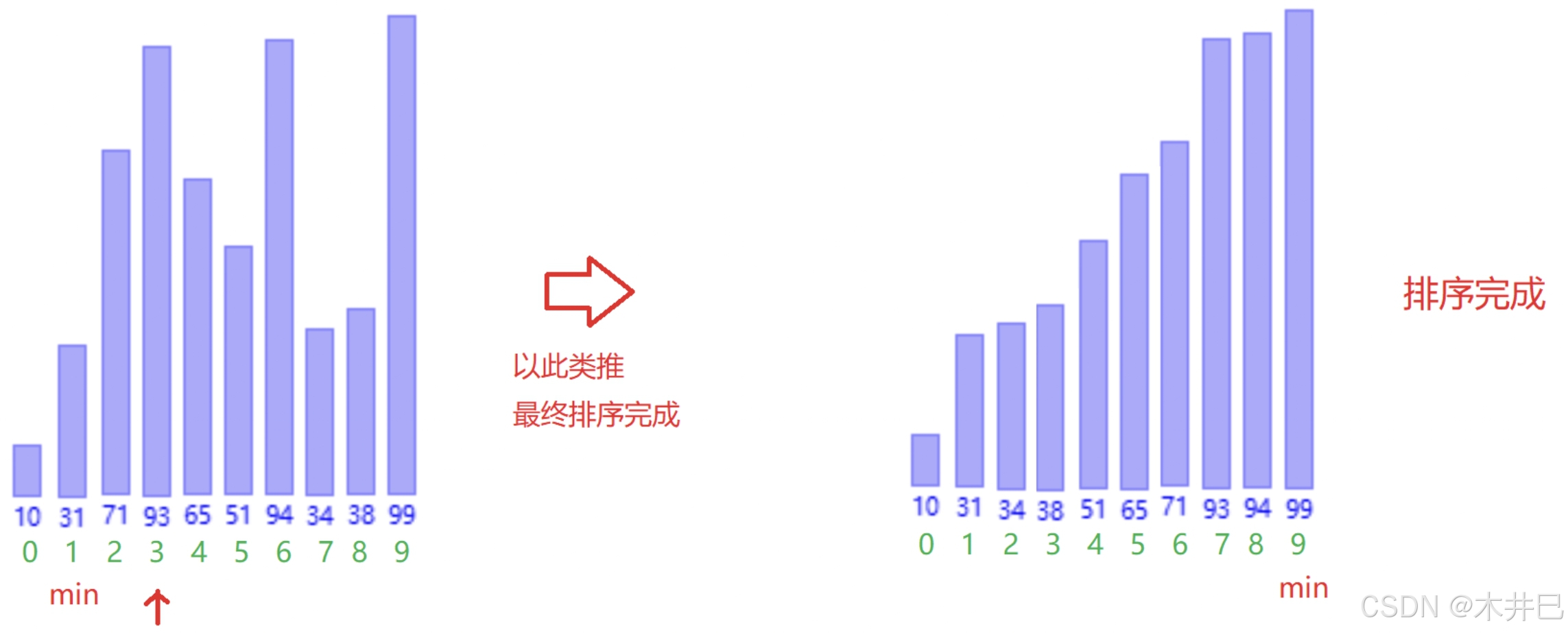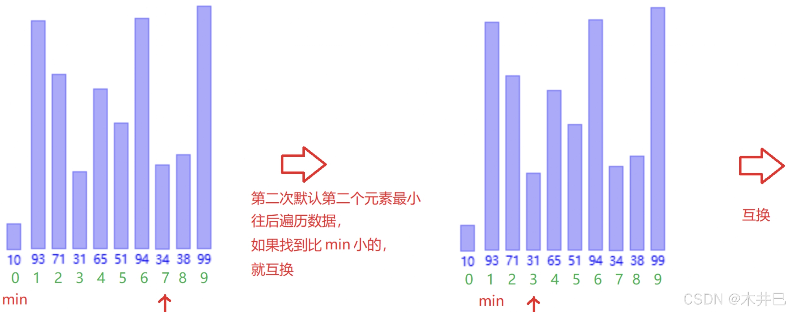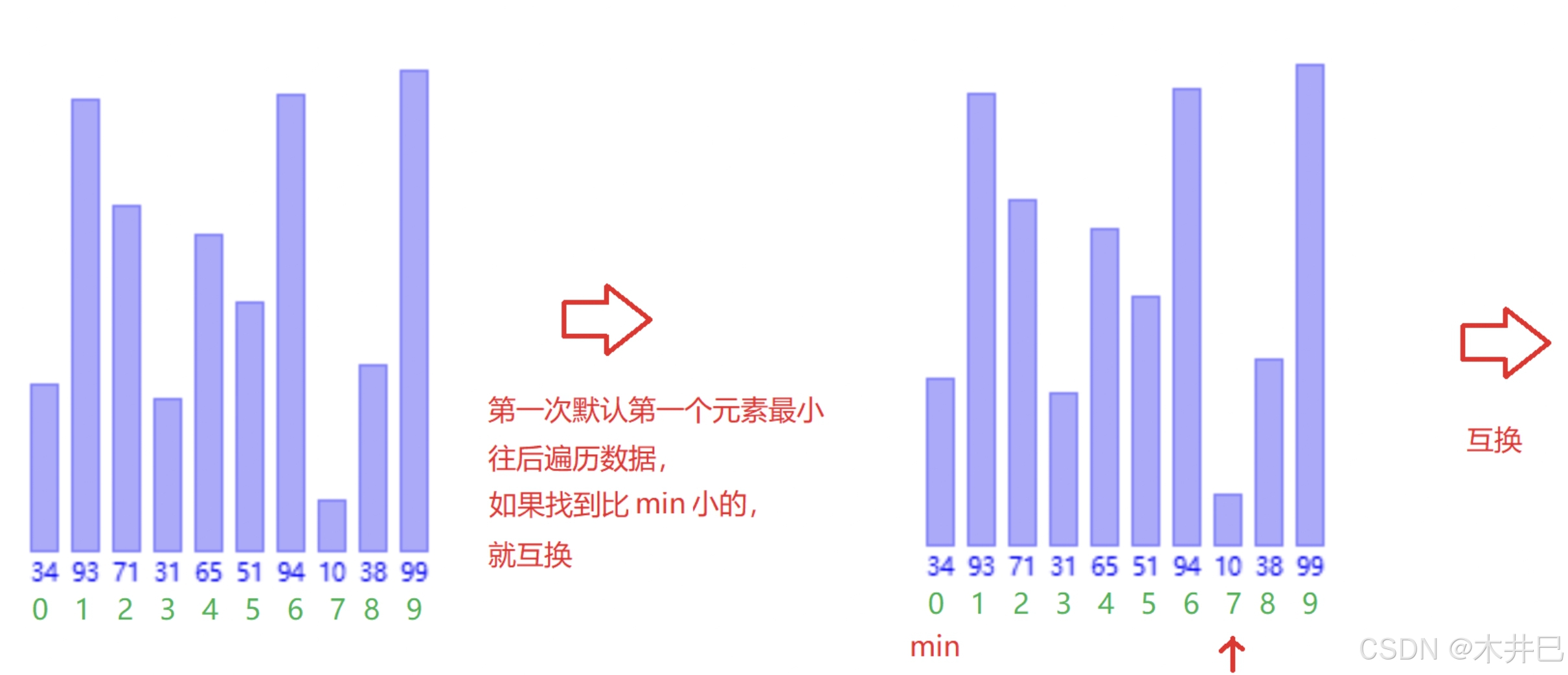 - 遍历数据,第一次默认第一个元素是最小的然后往后面走;当遇到比前面认定最小元素还小的值就记录下标;遍历完数据后再将两个值调换