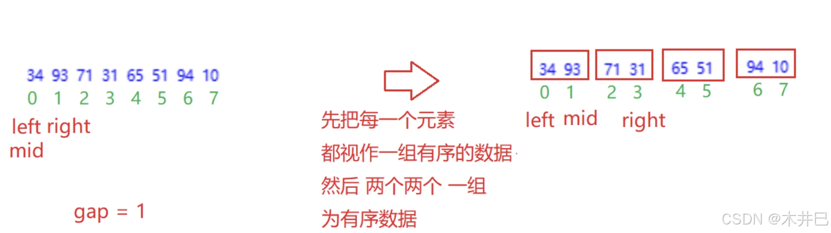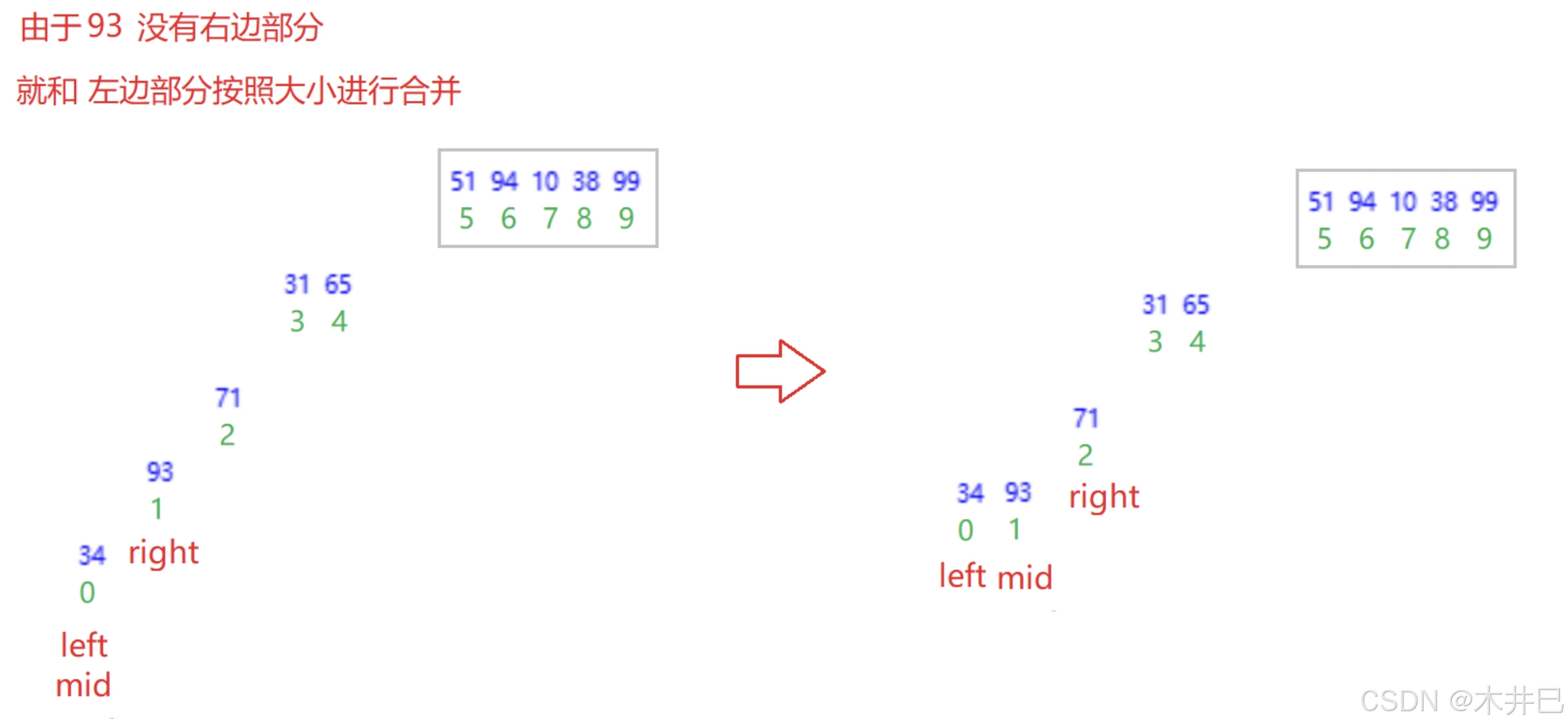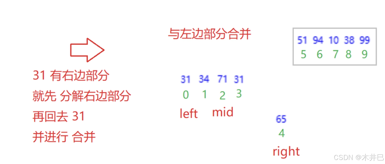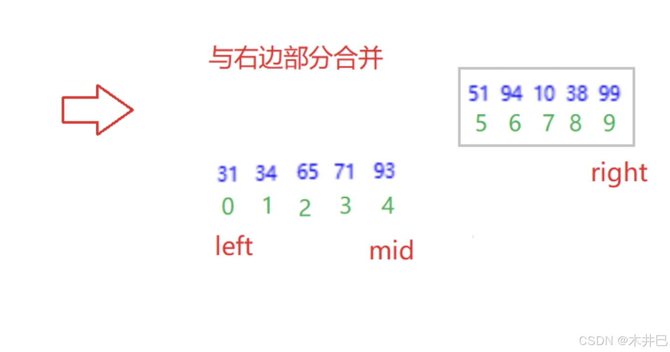 - 每一次定义三个下标left、mid和right, 通过下标实现合并数组操作