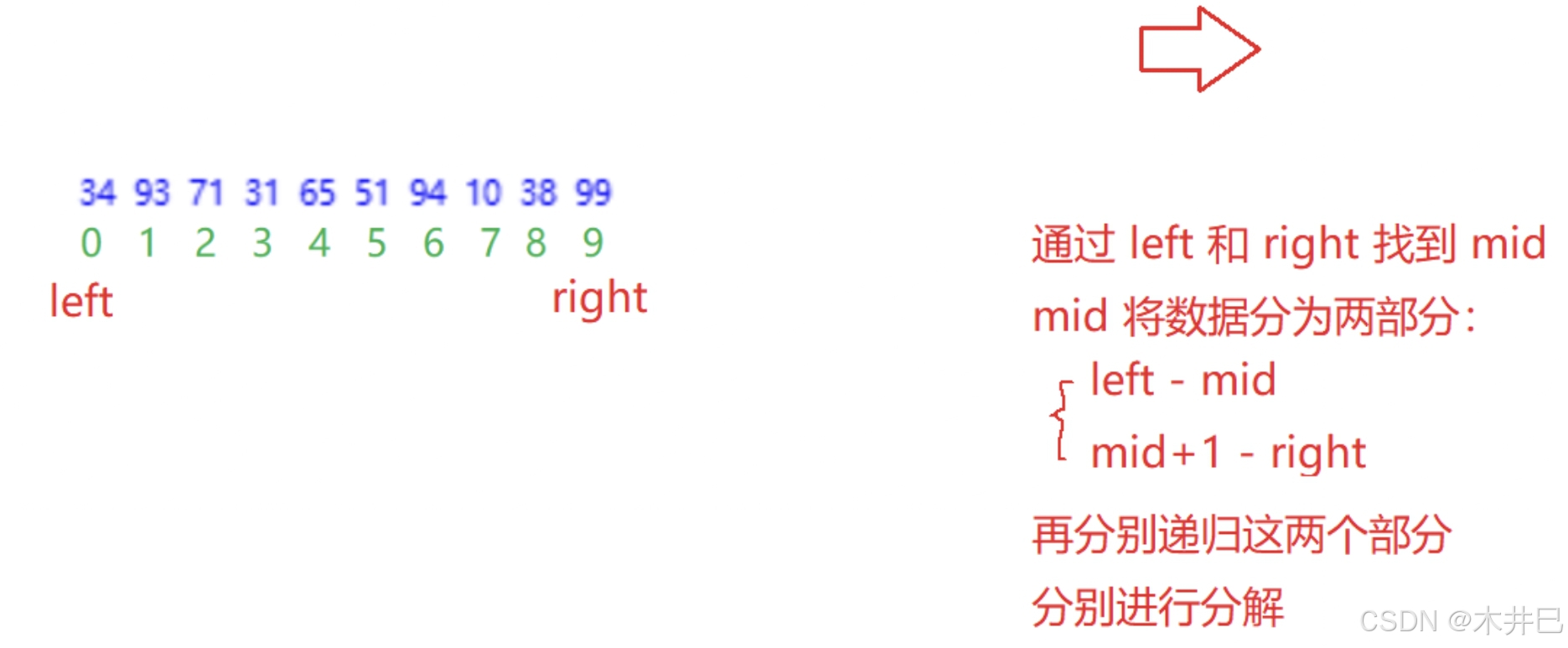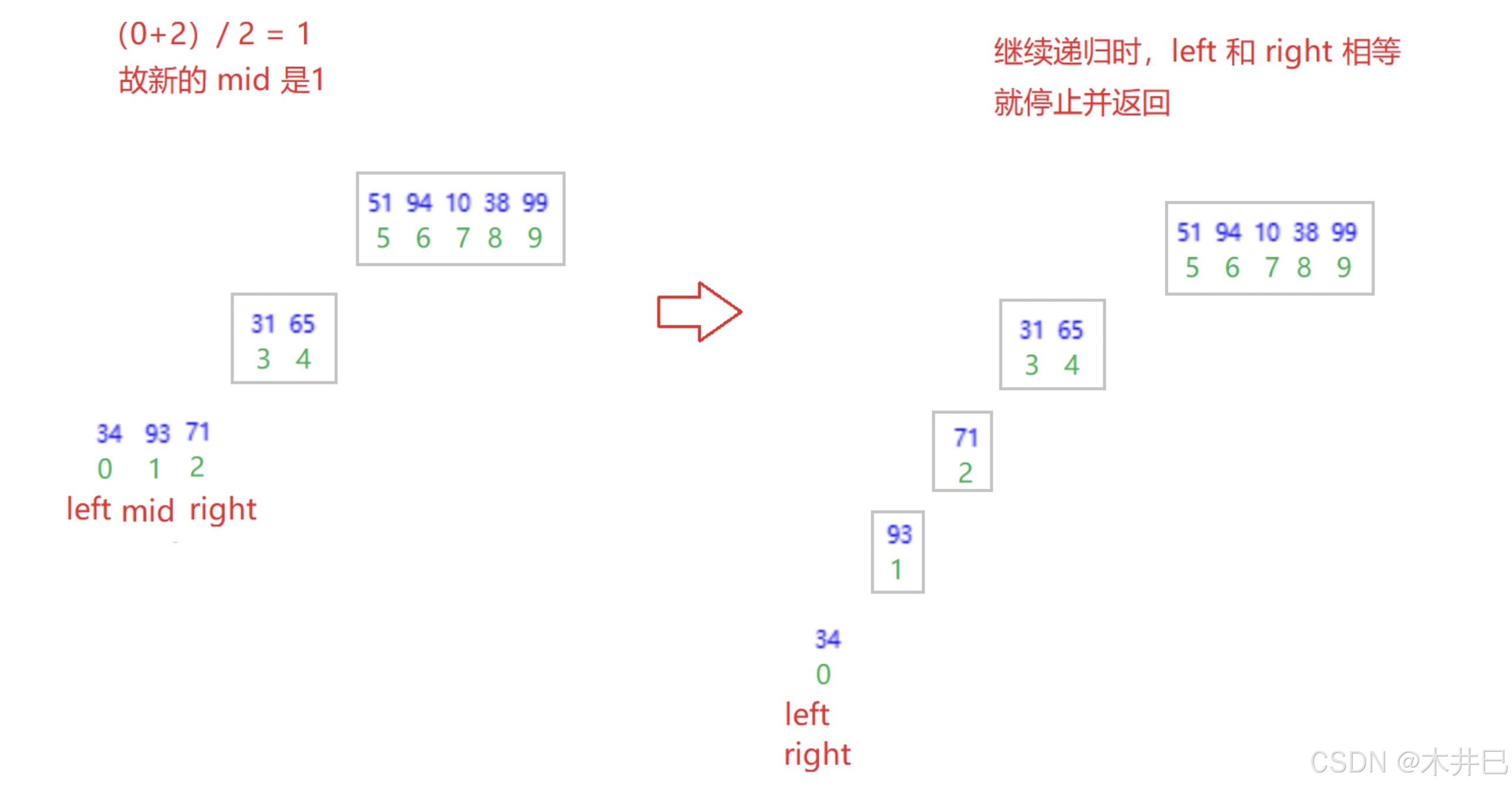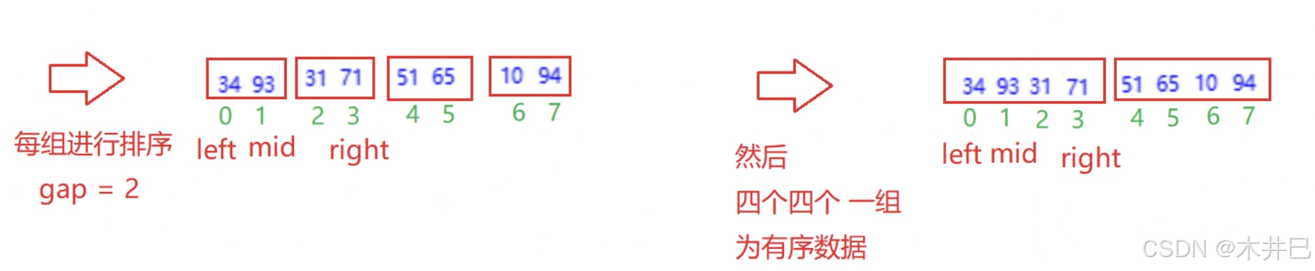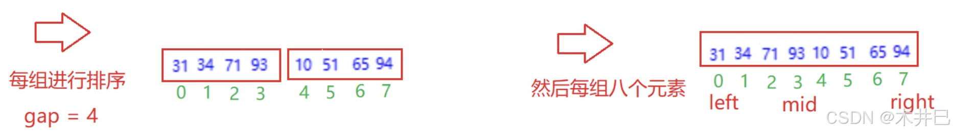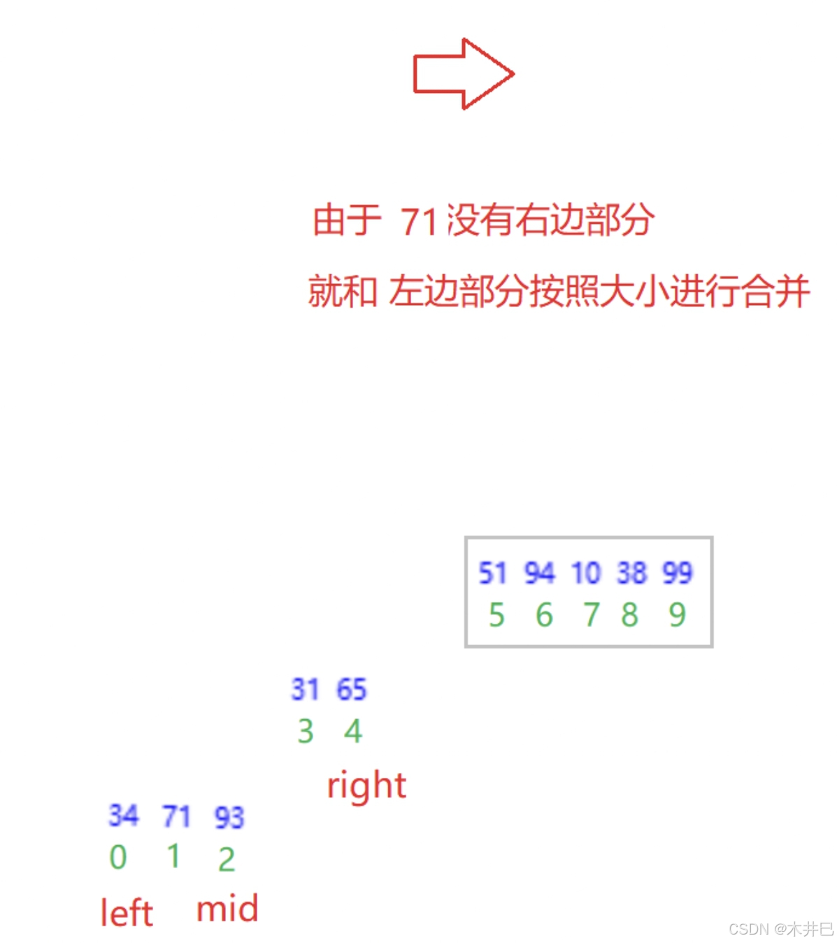 - 每一次定义三个下标left、mid和right, 通过下标实现合并数组操作