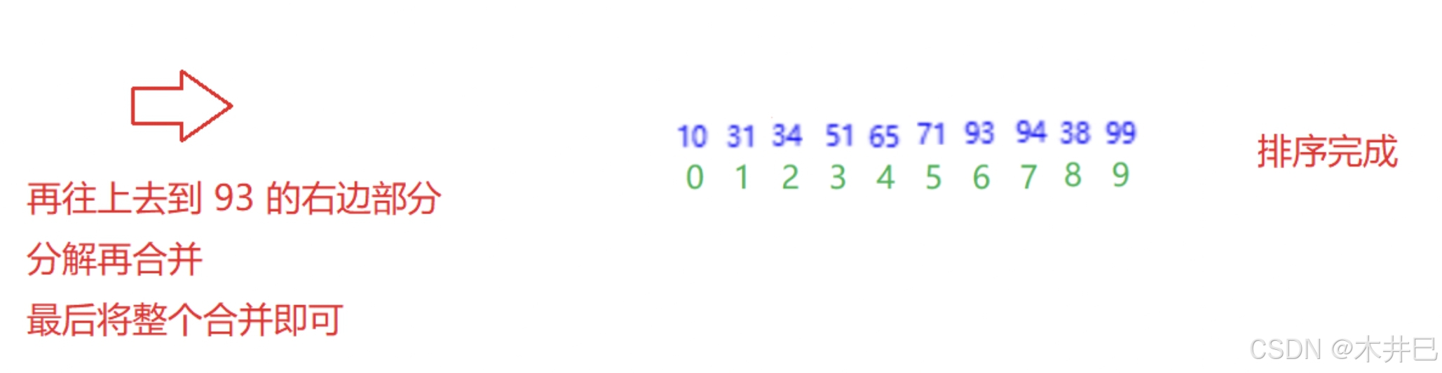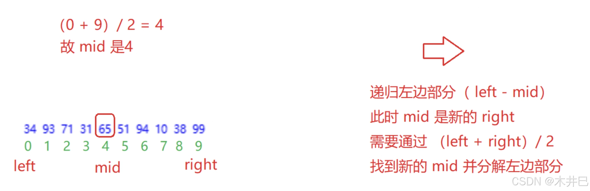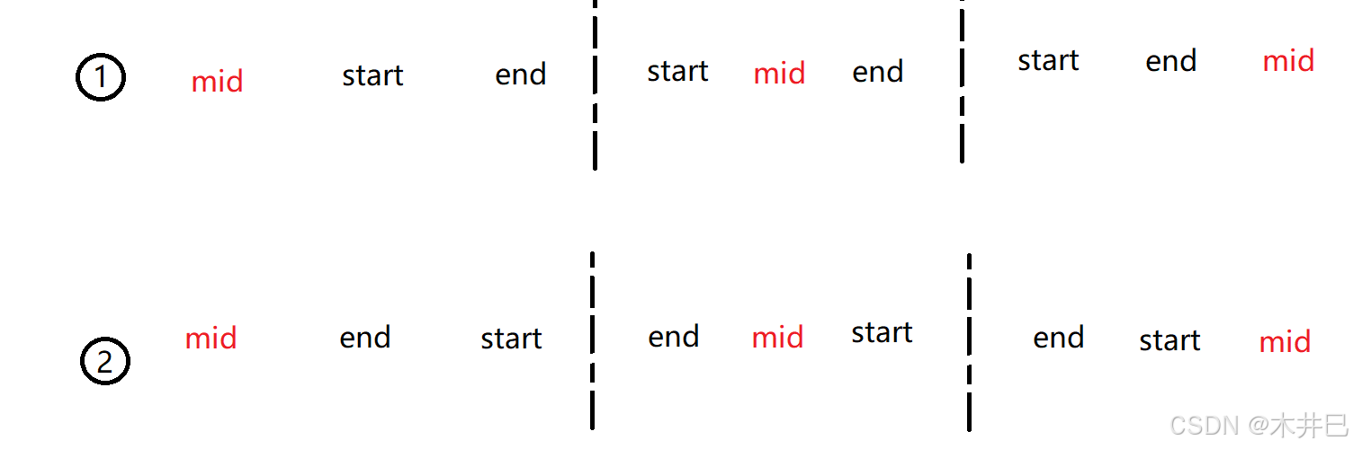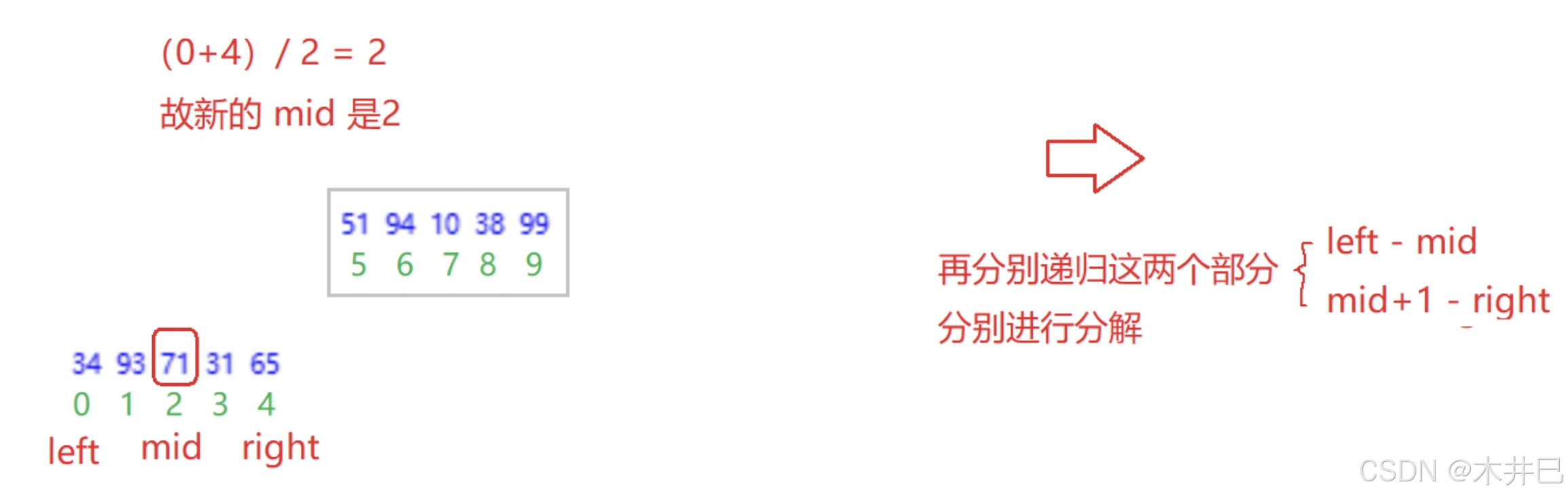 - 每一次定义三个下标left、mid和right, 通过下标实现合并数组操作