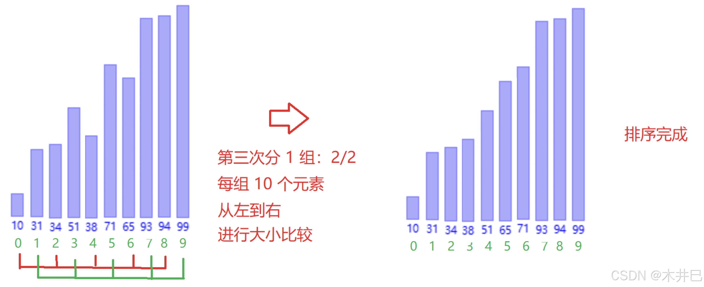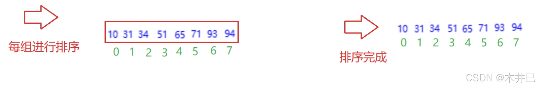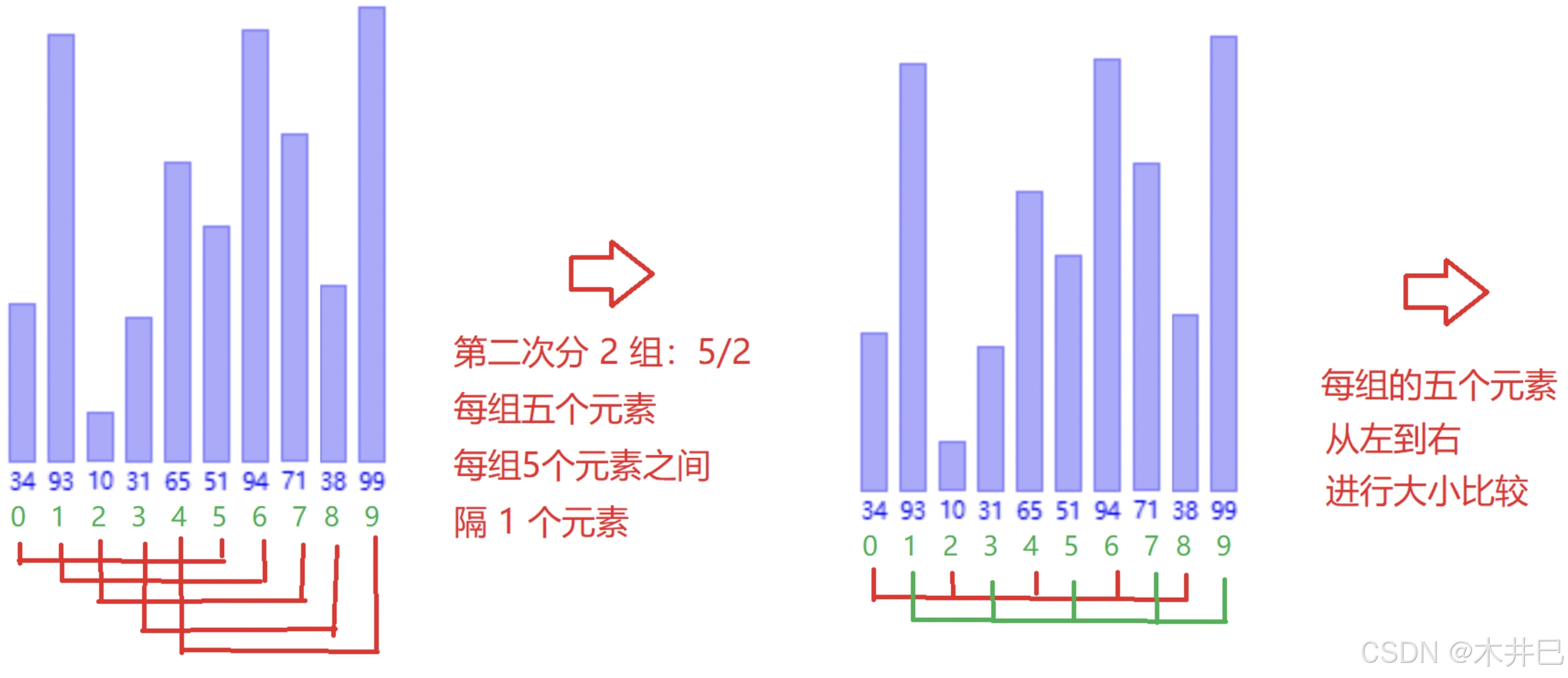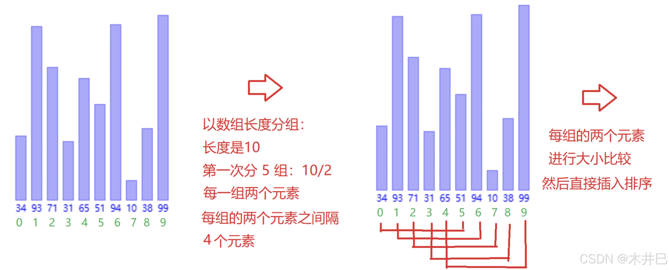 - 每一次按照数据长度的一半来分组,每一组交替进行插入排序