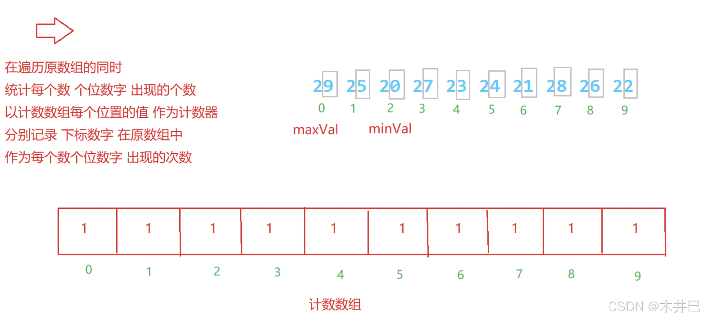 - 使用一个计数数组存储0~9数字每个数字出现的次数(将每个数字减去最小值的结果作为计数数组的下标)
