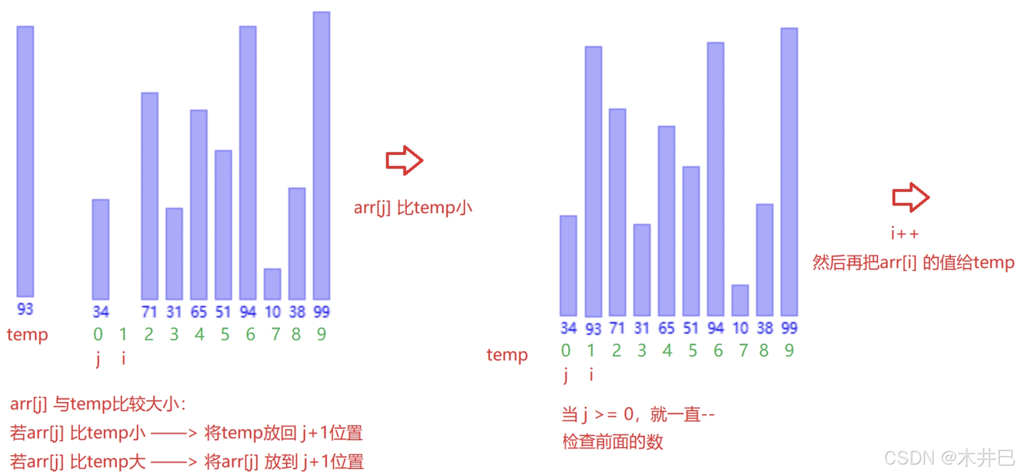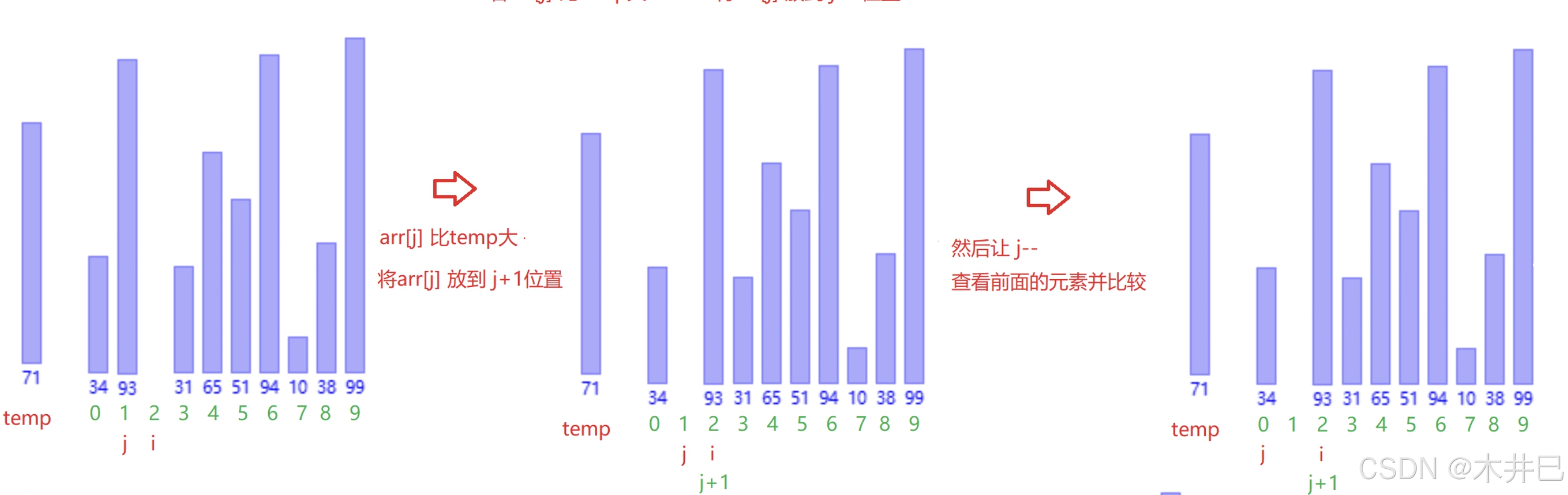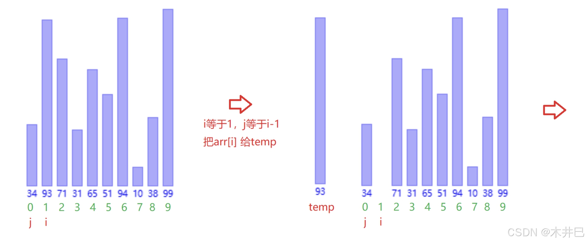 - 从第二个元素开始,与前面的元素进行大小比较: