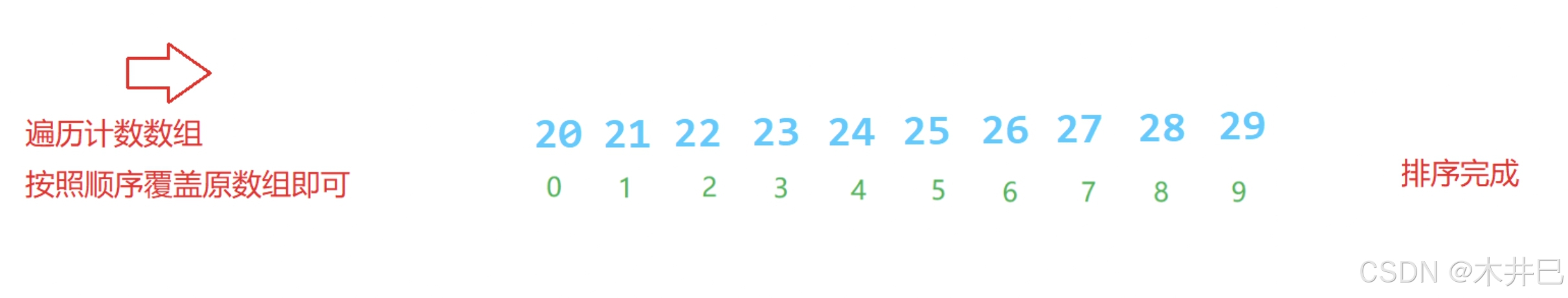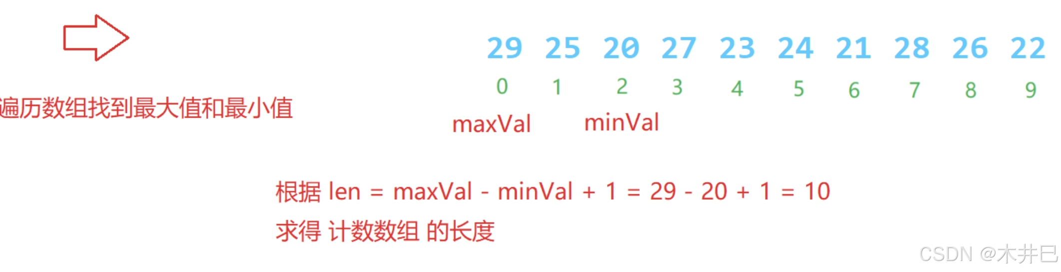 - 注意:1. 场景:数据集中在某个范围内,对于太发散的数据不适用;2. 需要先观察数据的最大和最小值,再计算计数数组的长度len = max - min+ 1