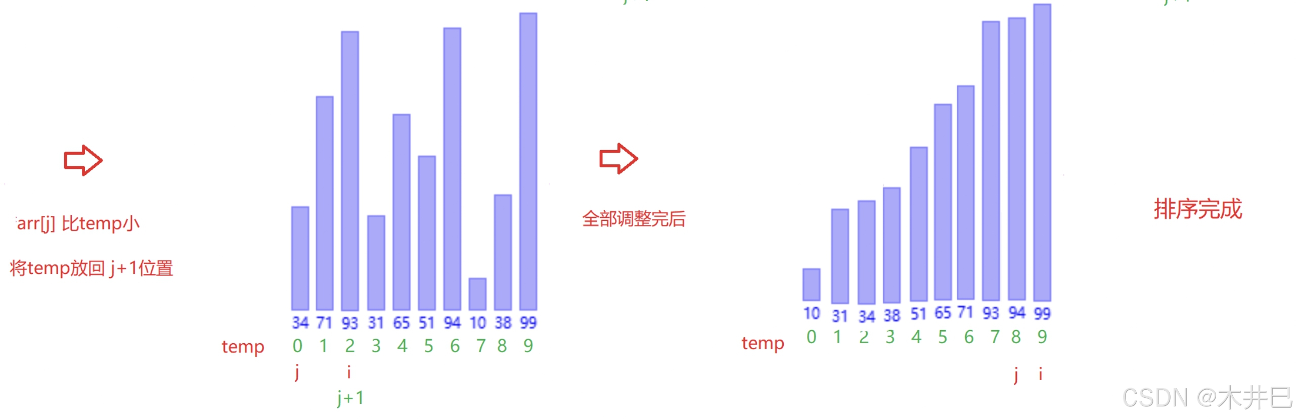 - 若比前面的元素小,就交换