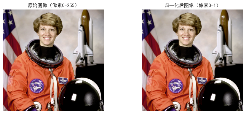 在模型训练或特征学习阶段,通常需要将像素值标准化到 [0,1] 区间,以消除亮度差异带来的影响。通过简单的数组运算即可实现: