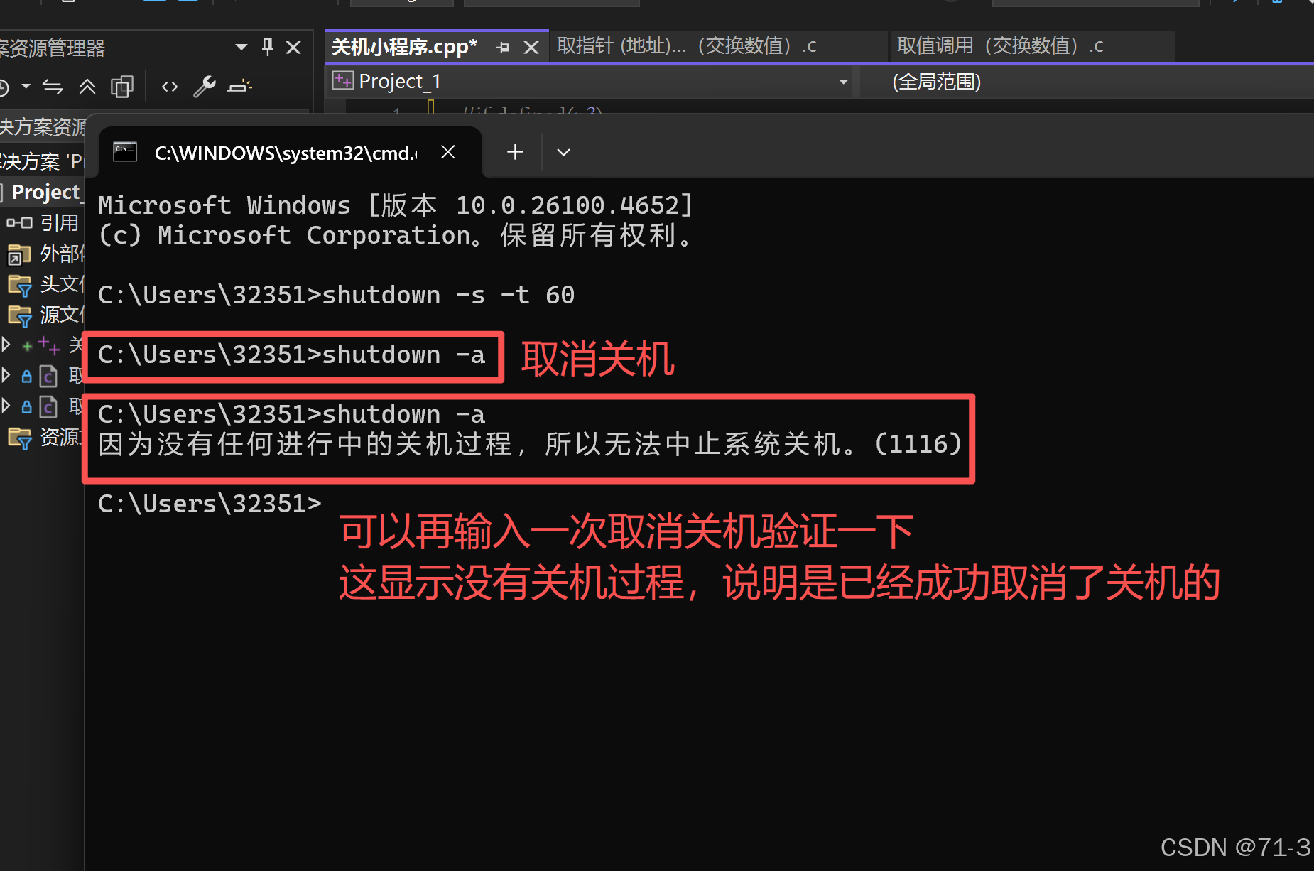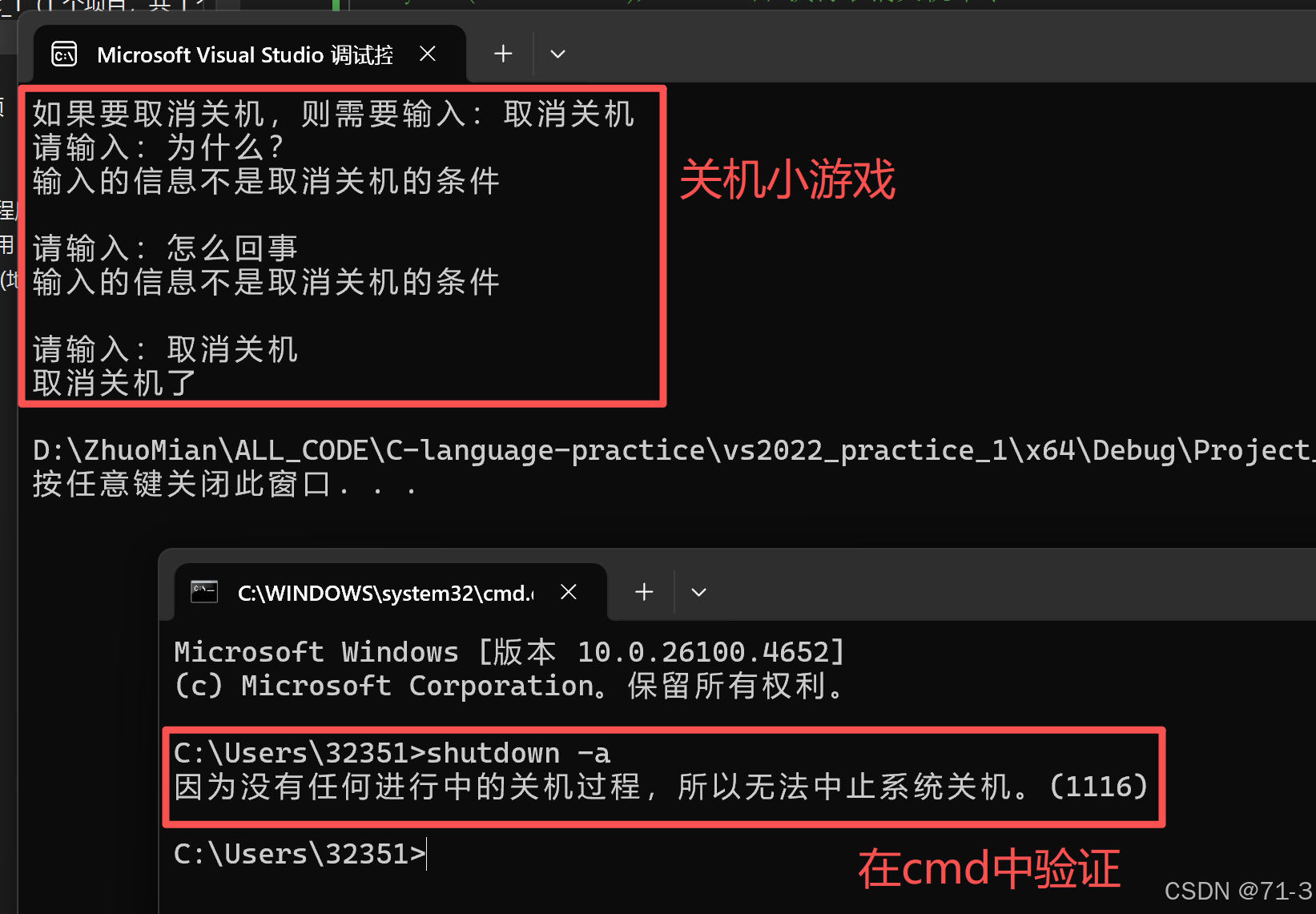 - 取消关机要在屏幕打印"取消关机" ,并且提示 关机取消了,结束程序
