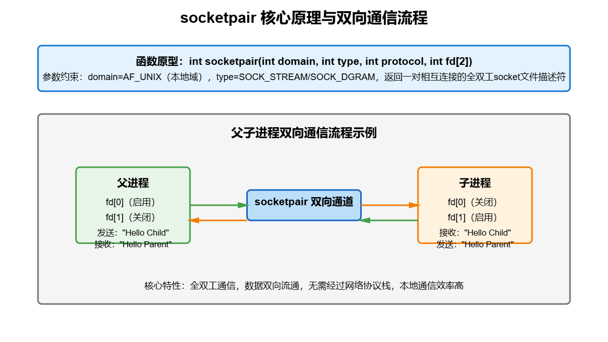 函数本质是创建一对"Connected Socket",这对socket在本地进程间直接通信,无需经过网络协议栈,因此效率远高于基于TCP/UDP的网络通信。其函数原型如下: