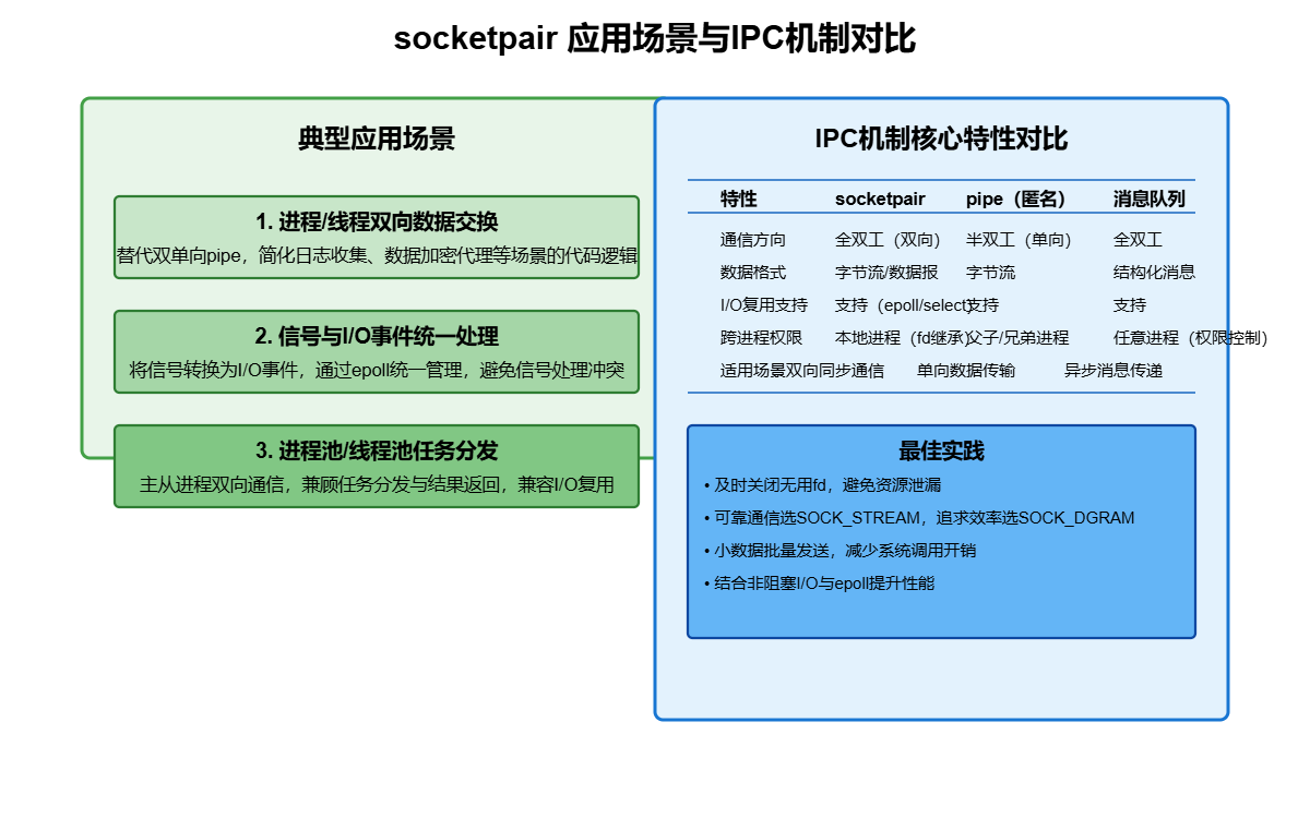 为帮助开发者选择合适的IPC工具,下表对比socketpair