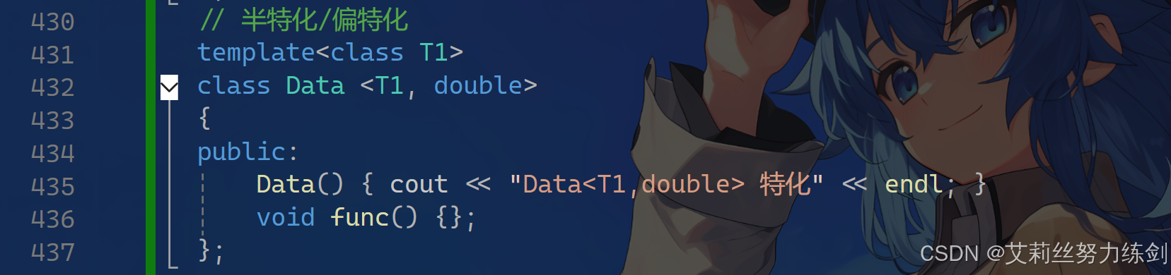 Data() { cout << "Data<T1,double> 特化" << endl; }