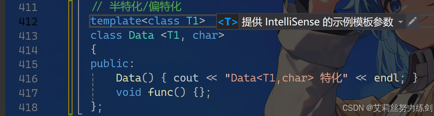 // Data() { cout << "Data<T1,char> 特化" << endl; }