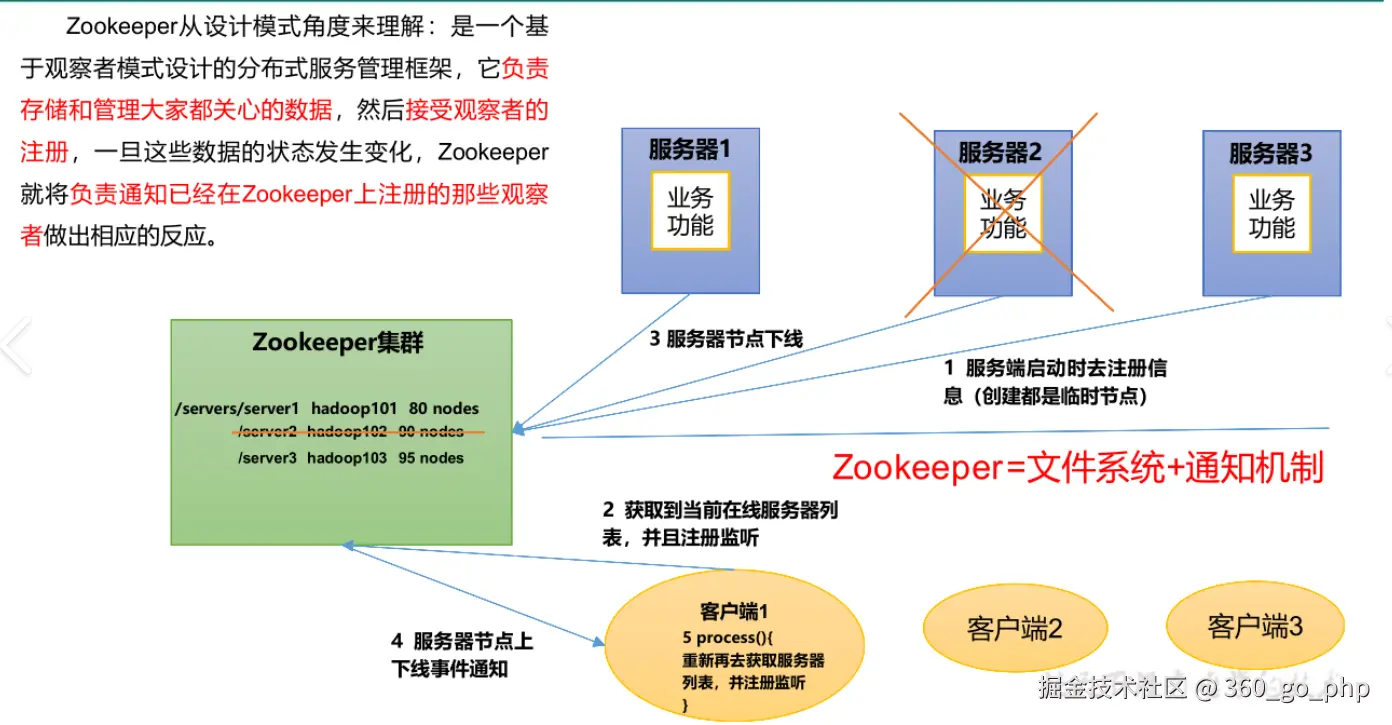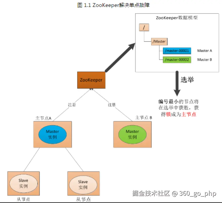 节点删除与选举:当Leader节点崩溃时,它在Zookeeper上的临时节点会被删除。其他候选节点会根据顺序号重新进行选举,确保系统总是存在一个Leader。