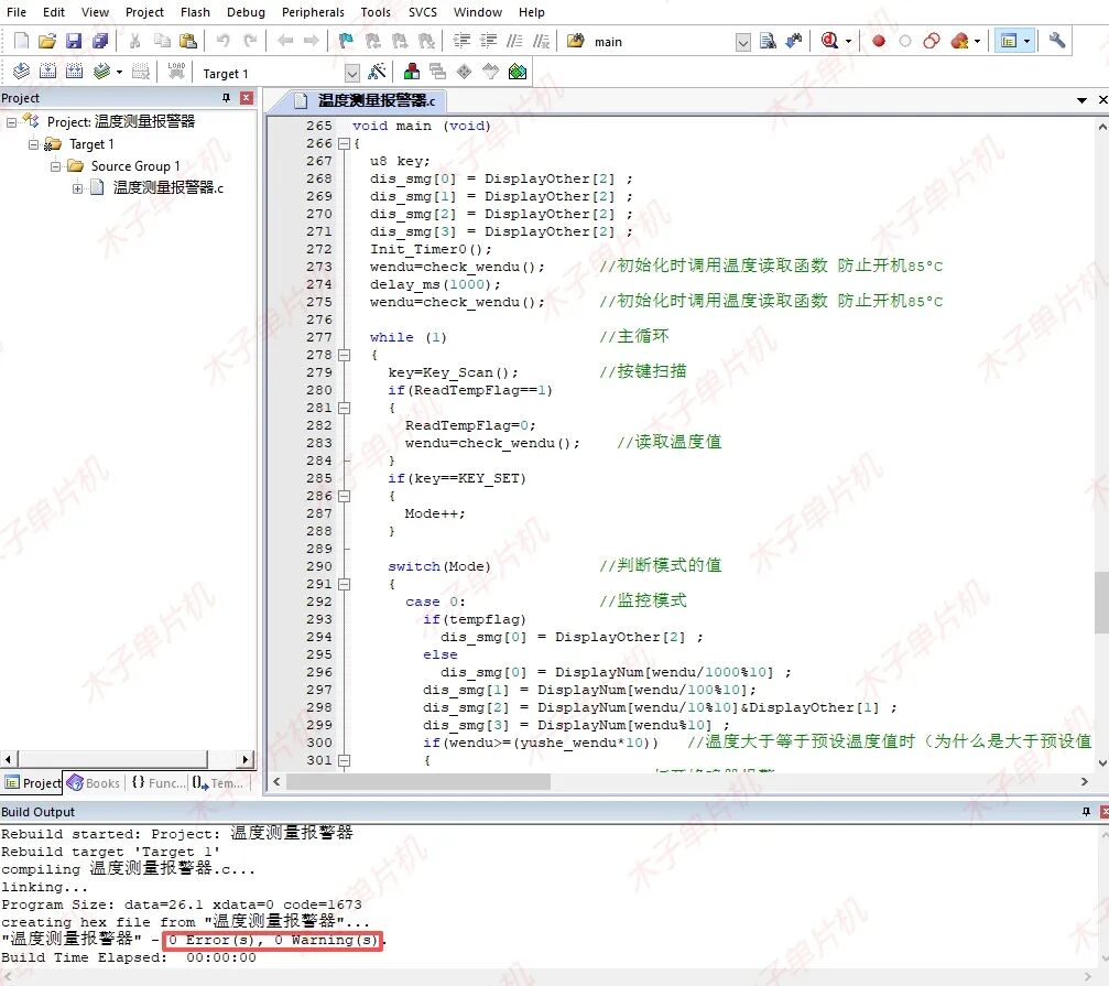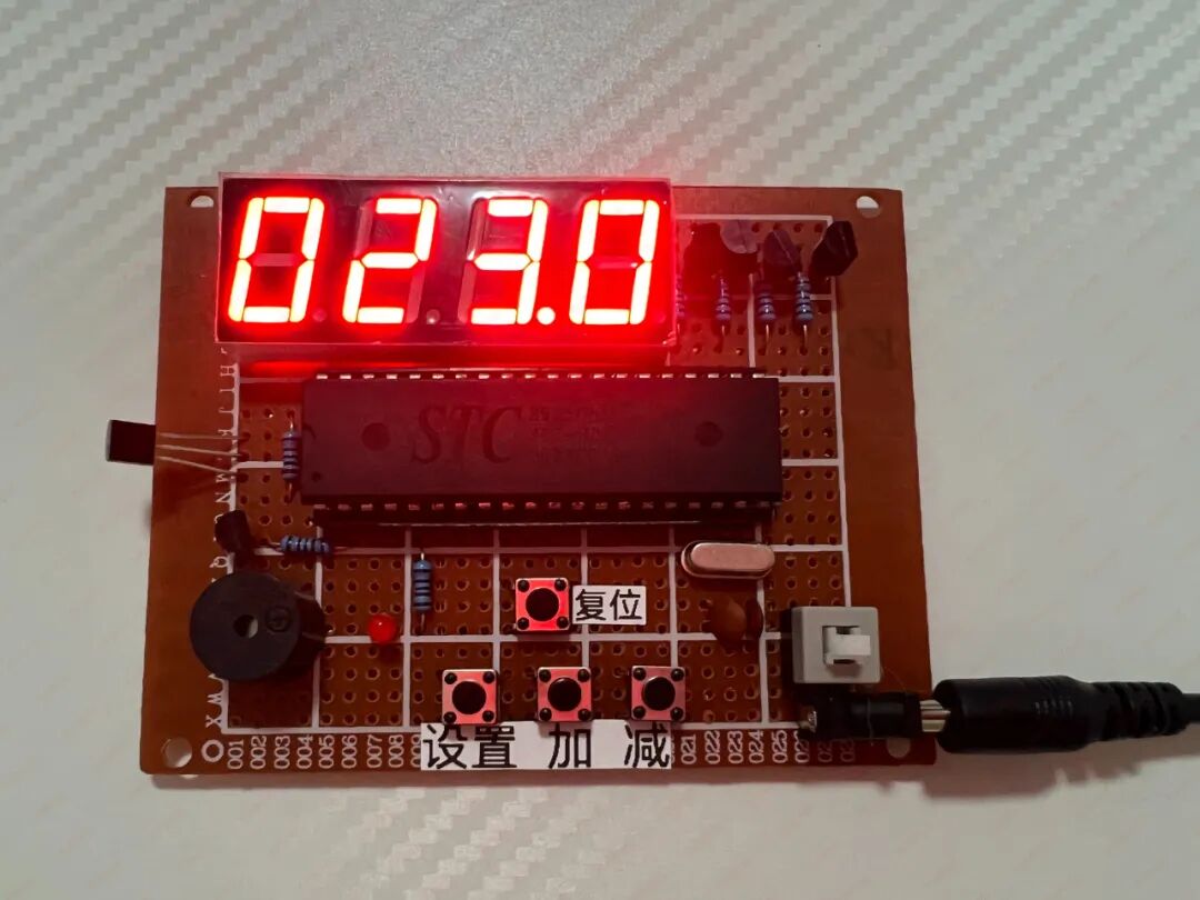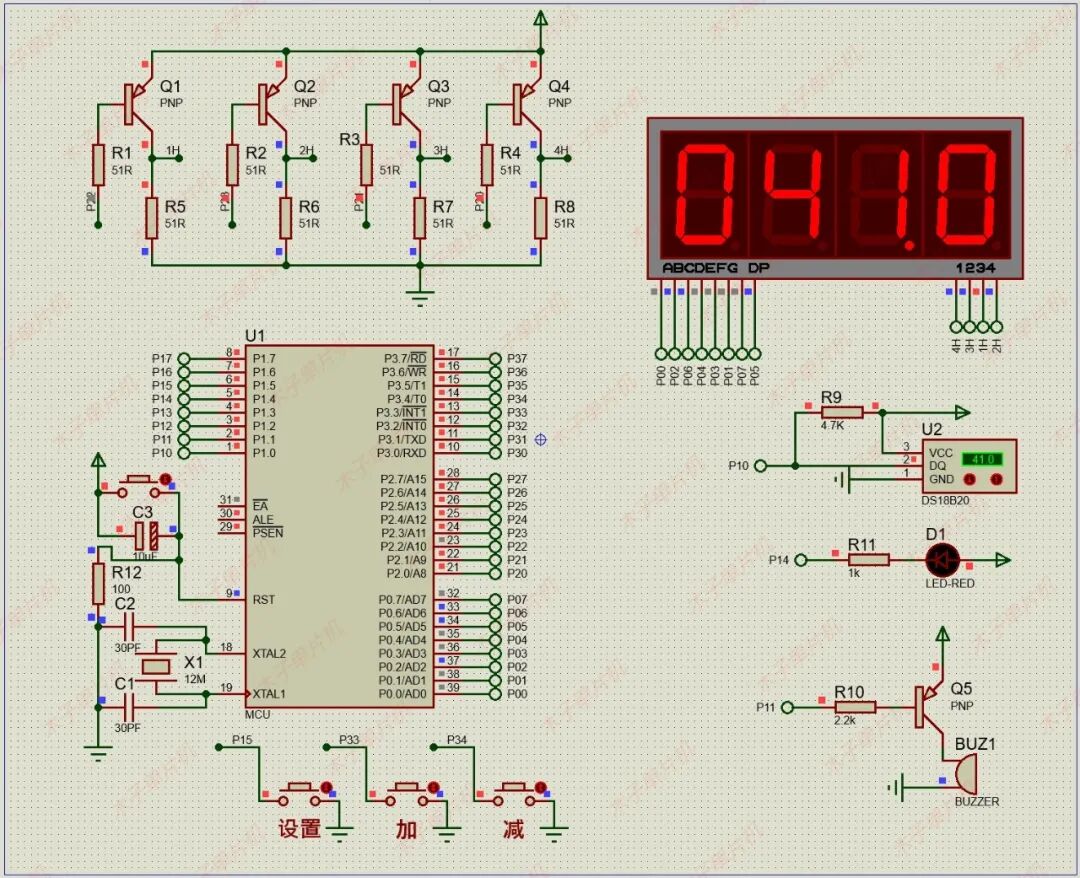 4.当测得温度超过阈值,蜂鸣器+LED声光报警;