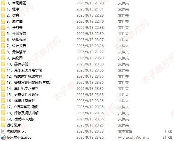 全部资料包括程序(含注释)、仿真源文件 、AD原理图、任务书、开题报告、设计报告、实物图、元件清单等。具体内容如下,全网最全! !
