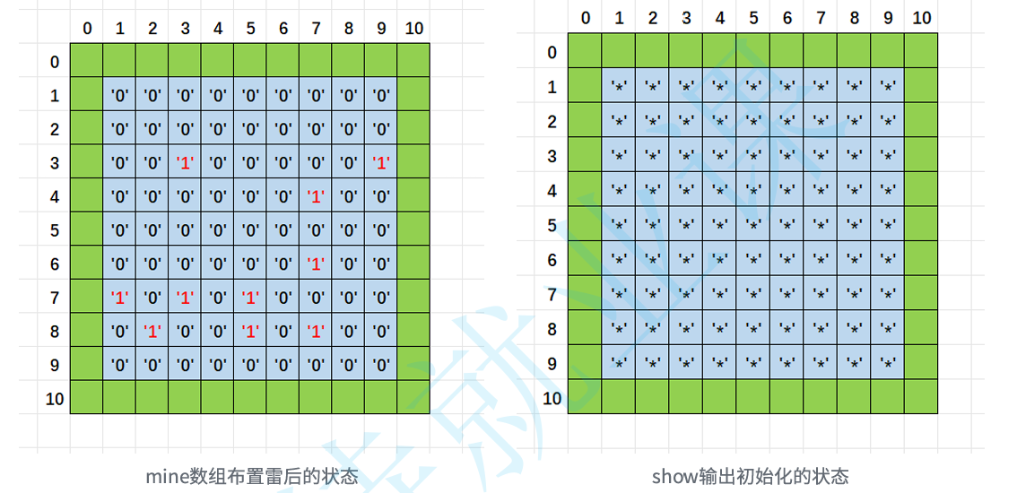 char mine[11][11] = {0}; ⽤来存放布置好的雷的信息