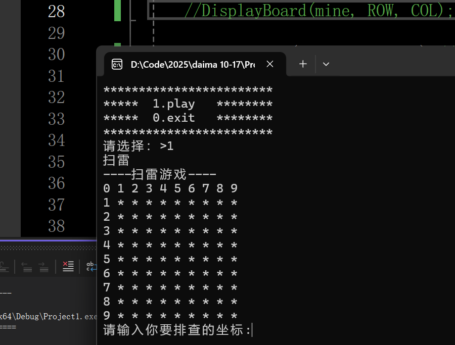 cpp#define _CRT_SECURE_NO_WARNINGS 1 #include"game.h" //棋盘初始化 void InitBoard(char arr[ROWS][COLS], int rows, int cols, int set)//11*11的棋盘 { int i = 0; for (i = 0; i < rows; i++)//行 { int j = 0; for (j=0; j < cols; j++)//列 { arr[i][j] = set;//将棋盘的参数设置为随机数,方便后面的设置棋盘的大小 } } } //打印棋盘 void DisplayBoard(char arr[ROWS][COLS], int row, int col)//11*11的棋盘,但是游戏只会显示9*9的棋盘 { int i = 0; printf("----扫雷游戏----\n"); //打印出第一列(横着的)的0-10的数字 for (i = 0; i <= col; i++)//列循环(横着的) { printf("%d ", i); } printf("\n"); //打印出第一行(竖着的)的1-10的数字 for (i = 1; i <= row; i++)//行循环(竖着的) { int j = 0; printf("%d ", i);//将第一行(竖着的)打印出来 for (j = 1; j <= col; j++)//列(横着的) { printf("%c ", arr[i][j]);//将行和列的星号打印出来 } printf("\n"); } } //在棋盘里面布置雷 void Set_mine(char arr[ROWS][COLS], int row, int col)//布置雷的位置 { int count = EASY_COUNT;//布置雷的数量,这里我们先布置10个雷 并将它存放在count里面 while (count) { int x = rand() % row + 1;//横 着的1-9格随机放置雷 rand函数是生成随机数 rand() % row余下0-8,加上1就是1-9了 int y = rand() % col + 1;//竖 着的1-9格随机放置雷 使用rand函数之前要调用srand函数生成种子 if (arr[x][y] == '0')//如果该位置没有布置雷,则为0 并且进入布置雷的循环 { arr[x][y] = '1'; //将上面那个不是0的位置(没有雷)填上1个雷 count--; //每布置完1个雷就减少一次我们布置雷的个数,一直到将我们的10个雷布置完为止 } } } //找出周围的雷 void Find_mine(char mine[ROWS][COLS], char show[ROWS][COLS], int row, int col) { int x = 0; int y = 0; int win = 0; while (win < row * col - EASY_COUNT)//row*col是81个格子,然后我们放了10个雷,所以还有71个格子不是雷,win< 是当我们把剩下71个格子全部点完之后,游戏就赢了,然后结束游戏 { printf("请输入你要排查的坐标:"); scanf("%d %d", &x, &y); if (x >= 1 && x <= row && y >= 1 && y <= col)//设置坐标的范围,row范围1-9 col范围1-9 { if (show[x][y] == '*')//如果这个格子没有被排查,就是一个*号,那么则可以排查这个格子,否则就会让你重新输入 { if (mine[x][y] == '1')//踩到雷的情况,就游戏结束 { printf("很遗憾,你被炸死了\n"); DisplayBoard(mine, ROW, COL);//被炸死后,显示出棋盘里面所有的雷 break; } else//不是雷的情况,我们就排查周围的雷 { int count = Get_mine_count(mine, x, y);//在mine棋盘中,将周围存在雷的数量存放到count里面 show[x][y] = count + '0';//将9*9棋盘的雷信息放到11*11棋盘里面去,加'0'是转换为雷的个数,1 2 3 4这样的,之前那是ASCOLL值的数字 DisplayBoard(show, ROW, COL);//将周围雷的熟练的信息显示出来,比如显示1,则说明周围有1个雷 win++;//当我们每排查一个数之后就加1,来记录我们已经排查了多少个格子,我们要一直排查到小于EASY_COUNT(10个雷)为止,然后跳出循环,游戏结束 } } else { printf("你已经排查了这个坐标,请输入其他的坐标\n"); } } else { printf("超出坐标范围,请在范围内重新输入\n"); } } if (win == row * col - EASY_COUNT)//当我们把71个不是雷的格子排查完以后,就只剩下了10个雷在棋盘上,最终游戏胜利,结束游戏 { printf("恭喜你,排雷成功,游戏结束\n"); DisplayBoard(mine, ROW, COL);//游戏结束后,显示出剩下10个雷的具体位置 } } 找出周围8个格子里面的雷的个数 (计算原理:将周围8个格子全部加起来,然后得出的值就是我们周围雷的数量,如果加起来是3,说明周围有3个雷 int Get_mine_count(char mine[ROWS][COLS], int x, int y) { return mine[x - 1][y] + mine[x - 1][y + 1] + mine[x][y - 1] + mine[x + 1][y - 1] + mine[x + 1][y] + mine[x + 1][y + 1] + mine[x][y + 1] + mine[x - 1][y + 1] - 8 * '0'; }