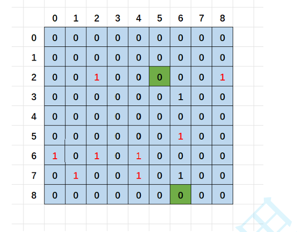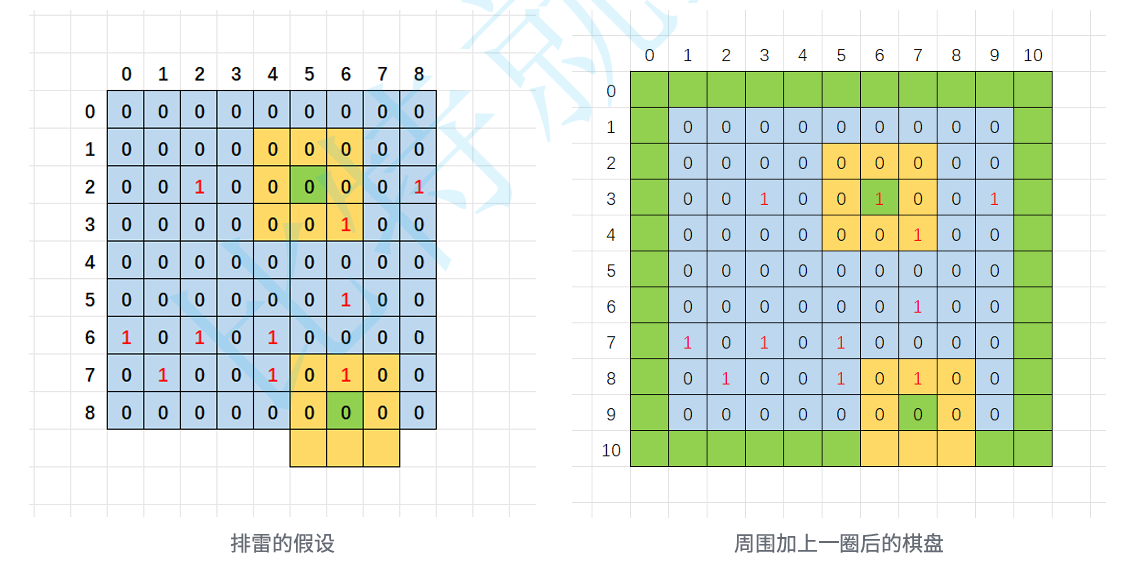 假设我们排查(2,5)这个坐标时,我们访问周围的⼀圈8个⻩⾊位置,统计周围雷的个数是1