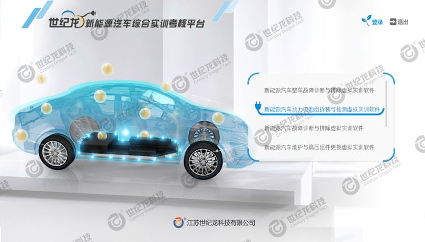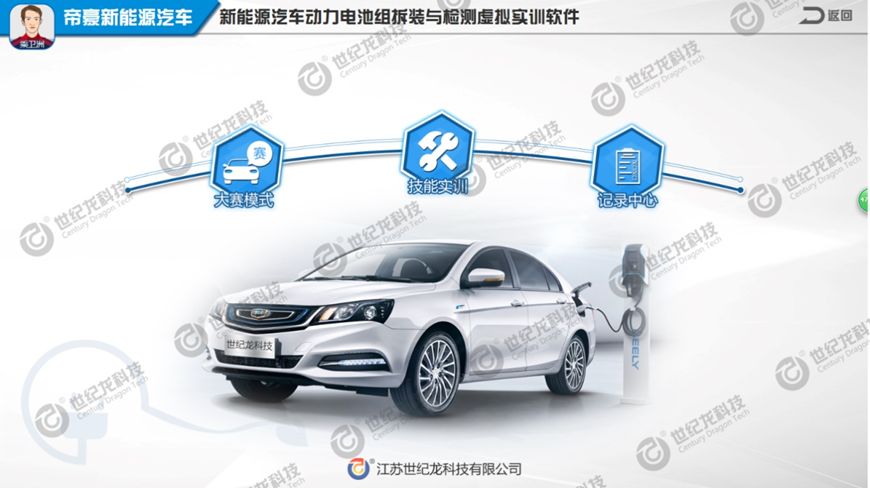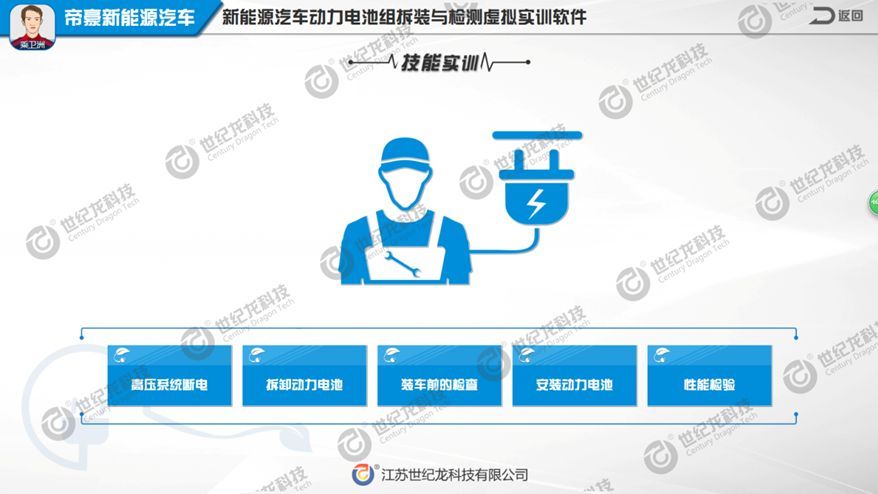 软件基于帝豪新能源车型开发,包含五个核心实训模块:高压系统断电、拆卸动力电池、装车前的检查、安装动力电池、性能检验。每个模块采用标准化流程设计,将高压安全防护和6S管理规范融入实训全过程。