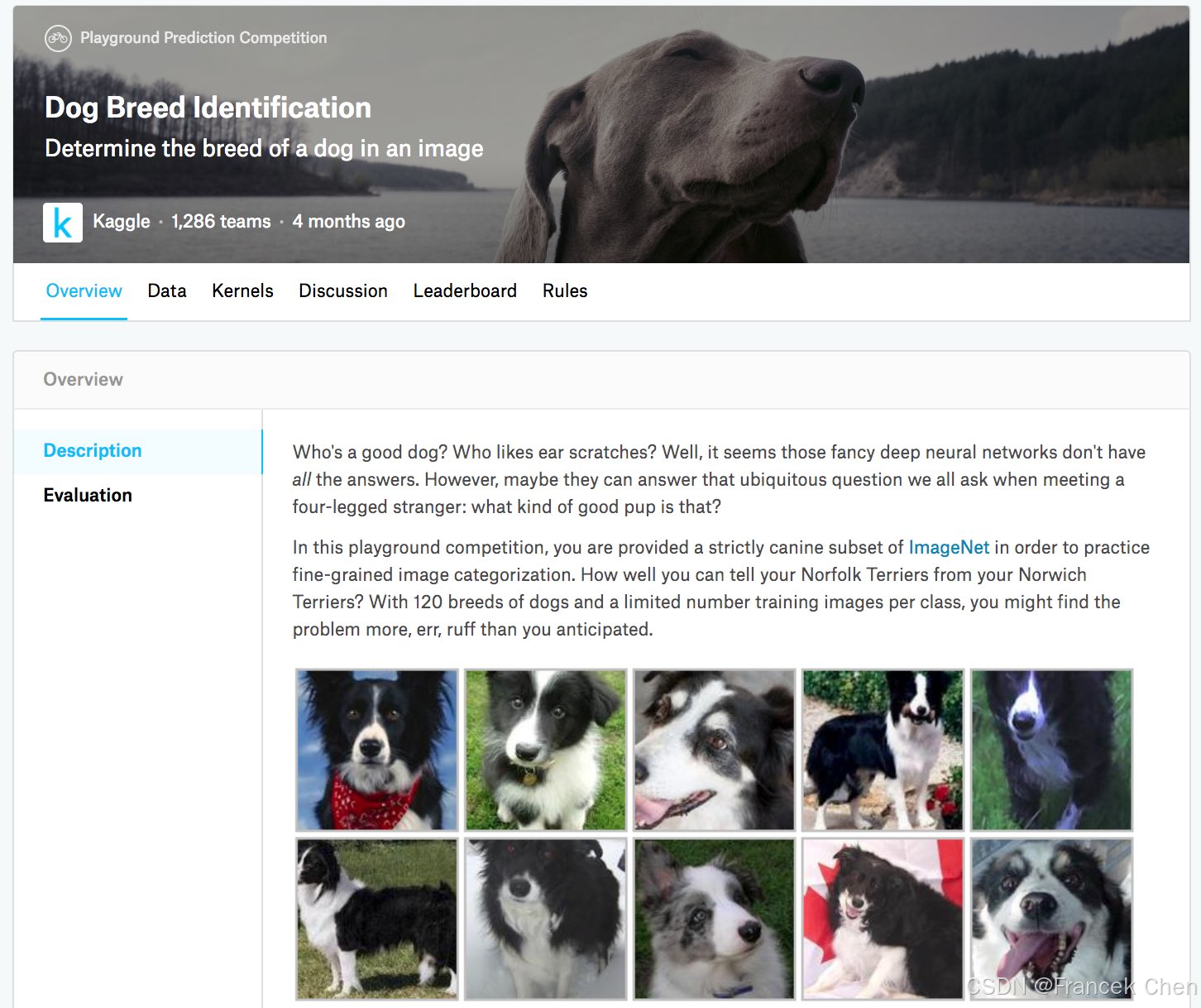 本文我们将在Kaggle上实战狗品种识别问题。本次比赛网址是https://www.kaggle.com/c/dog-breed-identification。图1显示了鉴定比赛网页上的信息。需要一个Kaggle账户才能提交结果。