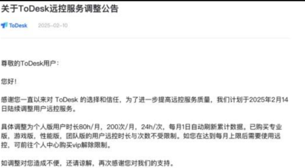 并且最让免费版用户难以接受的是,ToDesk在今年的2月份调整免费用户的额度,这样看似是免费,但是对于一些频繁使用但是又没有专业版那些需求的用户来说,显然是不够用的。至少对于大部分程序员来说,这点时间是绝对不够用的。