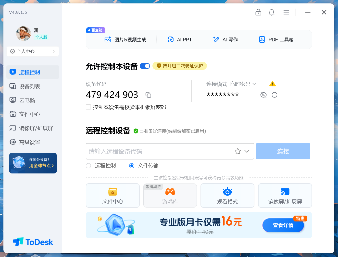 ToDesk免费版仅支持基础远程桌面、文件传输(限速)、远程摄像头,而UU远程免费开放4K画质、无限制文件传输、远程开机、隐私屏等全部功能。ToDesk的"专业版"需40元/月,解锁120帧、隐私屏、高速传输,但UU远程免费版已覆盖这些功能。 - 企业级场景适配