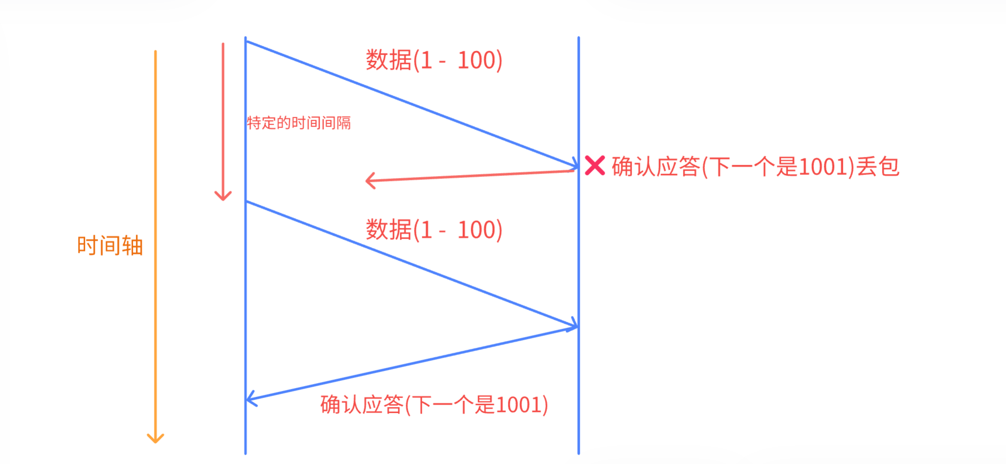 - 如果主机A在一个特定的时间间隔内没有收到B发来的确认应答,就会进行重发