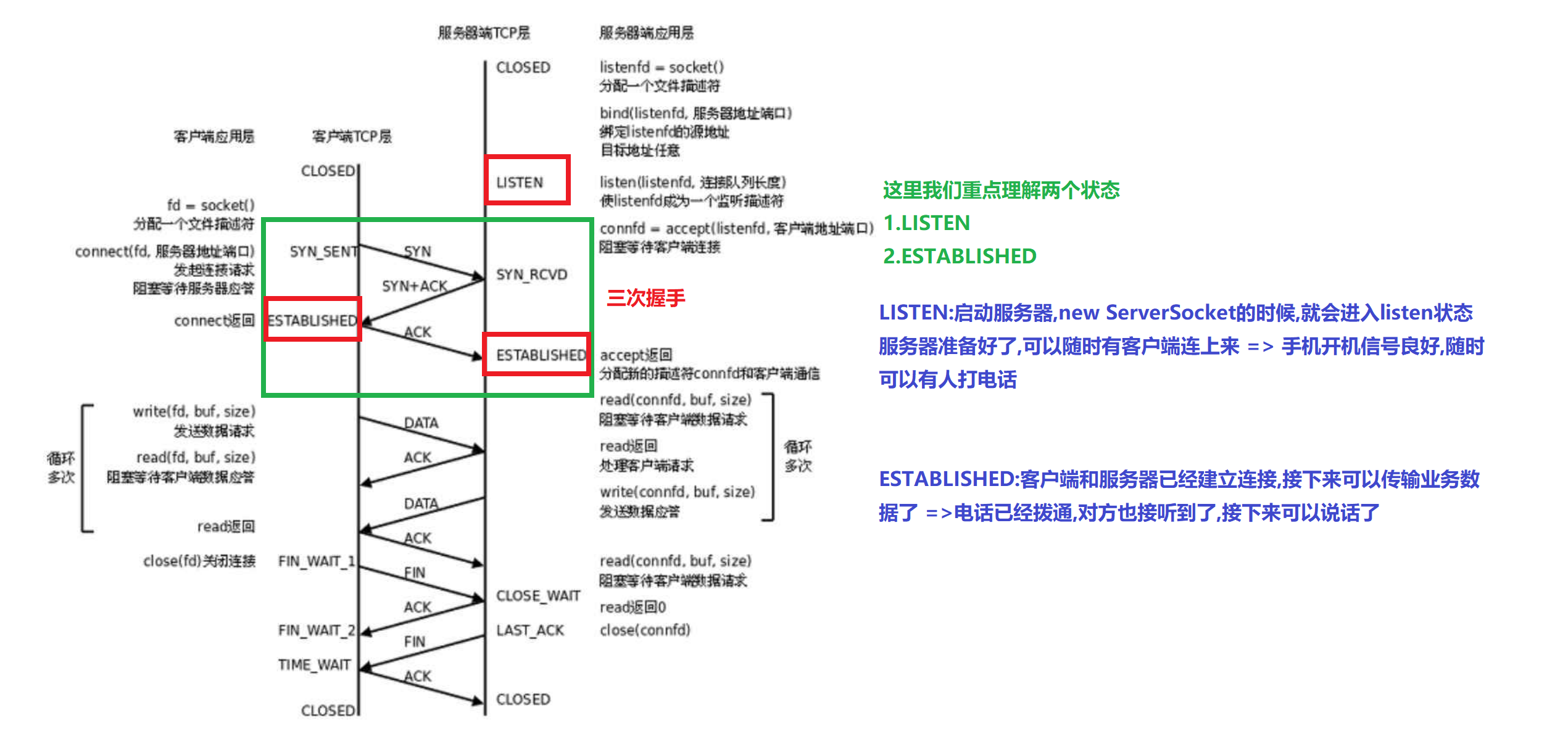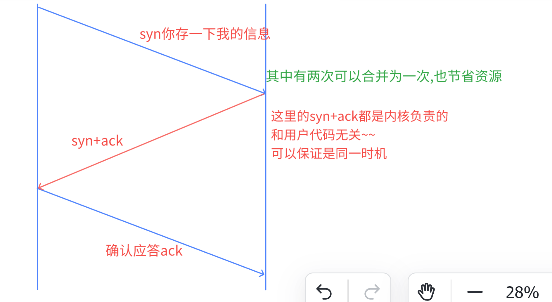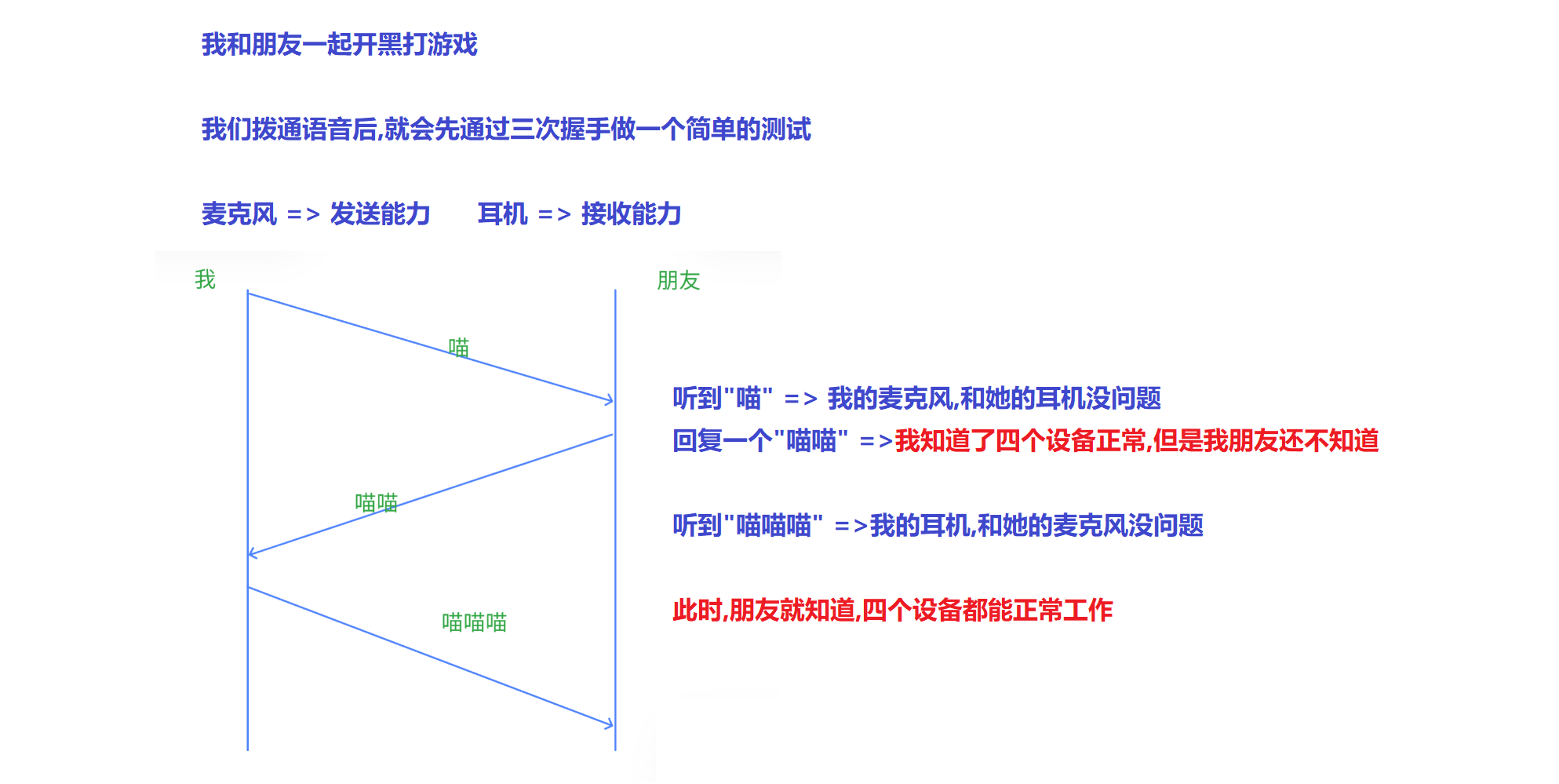通过上述讨论,建立连接的操作,如果只握手两次,是不够的,因为有一个设备并不能知道对方的接受能力和自己的发送能力是否正常