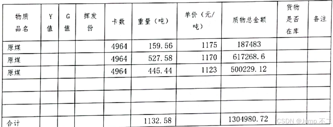 物质品名 | Y值 | G值 | 挥发份 | 卡数 | 重量(吨) | 单价(元/吨) | 质物总金额 | 货物是否在库 | 备注 |