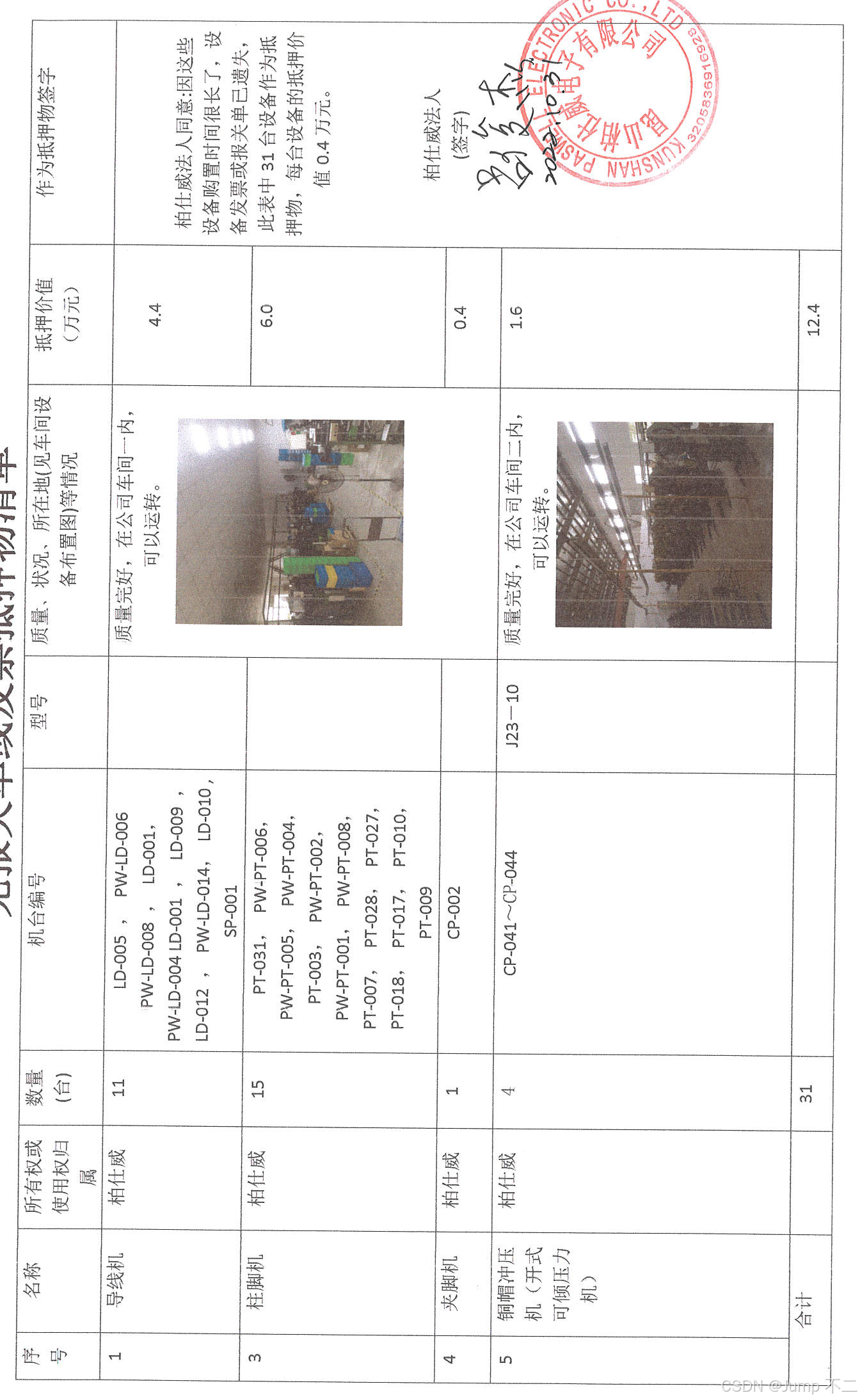 | 4 | 夹脚机 | 柏仕威 | 1 | CP-002 | | 质量完好,在公司车间一内,可以运转。 | 0.4 | 柏仕威法人同意:因这些设备购置时间很长了,设备发票或报关单已遗失,此表中31台设备作为抵押物,每台设备的抵押价值0.4万元。柏仕威法人(签字) |