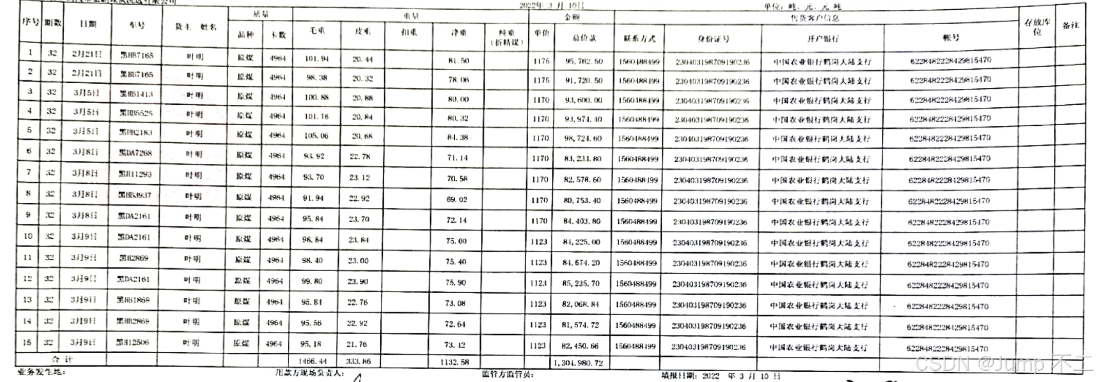 | 1 | 32 | 2月21日 | 黑HB7165 | 叶明 | 原煤 | 4964 | 101.94 | 20.44 | | 81.50 | | 1175 | 95,762.50 | 1560488499 | 230403198709190236 | 中国农业银行鹤岗大陆支行 | 6228482228429815470 | | |