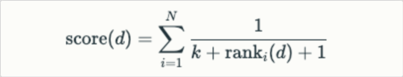 - RRFRanker的核心思想是根据每个结果在其检索列表中的排名位置来计算分数。具体而言,算法使用以下公式为每个结果分配分数: