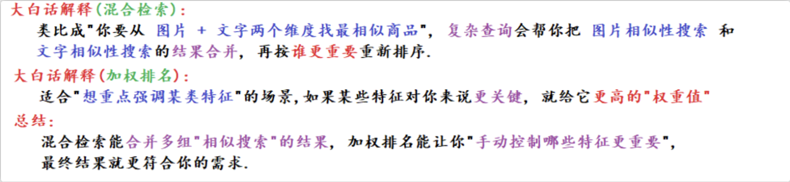 混合检索:要对两组 ANN 搜索结果进行合并和重新排序,有必要选择适当的重新排序策略。支持两种重排策略:加权排名策略(WeightedRanker )和重排序策略 (RRFRanker)。在选择重排策略时,需要考虑的一个问题是,在向量场中是否需要强调一个或多个基本 ANN 搜索。