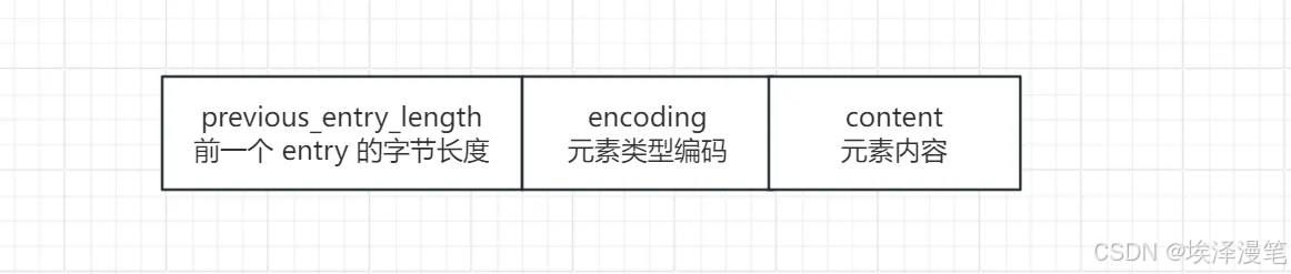 - 单个entry:存储元素的长度、编码类型及实际数据,根据元素的大小和类型采用不同的压缩编码。格式为: