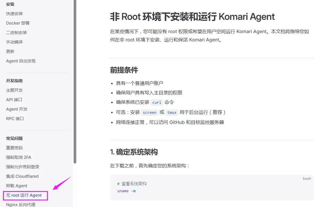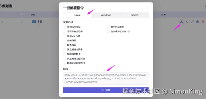部署的命令根据服务的类型而不同,这里以Linux为例。安装的选项,可以按需选择。然后复制指令即可: