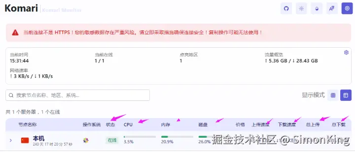 ,成功会后就可以在服务端查看监控的详细信息了。但是部分机器或者配置原因会导致komari-agent-linux-amd64