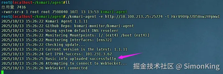 在下载完成后,您需要为 Komari Agent 文件赋予执行权限: