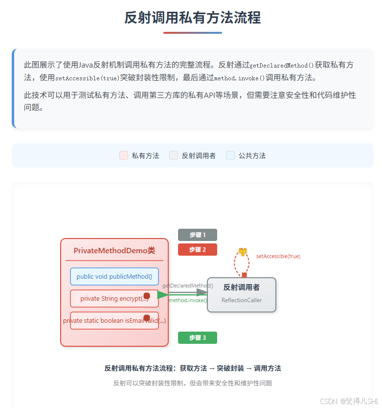 )。- 版本兼容性风险:私有方法属于类的内部实现,第三方库升级时可能被删除或修改,依赖反射调用会导致兼容性问题。