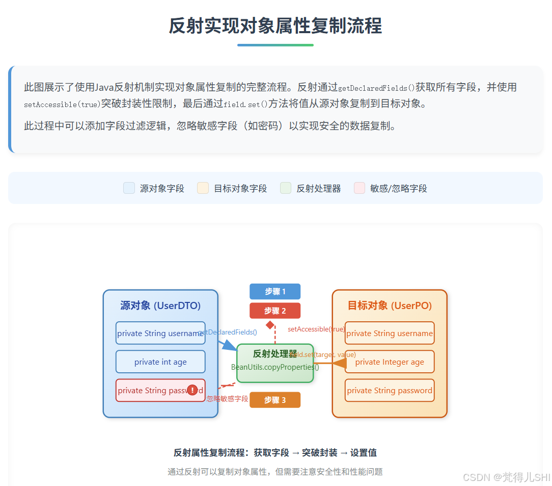 核心步骤是动态获取字段→突破访问限制→读取源值→写入目标对象,流程如下: