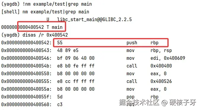 1、查看main函数的内存地址:0x400542,未下断点之前,这个位置的值是0x55,对应的汇编指令是push rbp