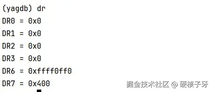 硬件断点是基于CPU中的8个调试寄存器DR0-DR7实现的。其中DR4、DR5是保留的。DR6为调试状态寄存器,标识哪个断点触发了中断。DR7可以看成是调试寄存器中的控制寄存器,比如开关硬件断点。所以算下来,硬件断点最多只能下四个,即DR0-DR3。是不是没概念,别急,文章后面证明给你看