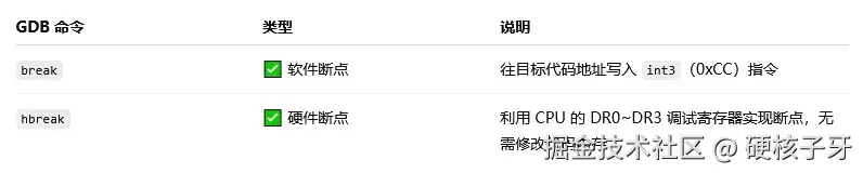 从gdb的角度,让程序断下来的两个方式:软件断点、硬件断点