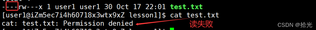 当我们将拥有者的所有权限取消,对文件test.txt进行读操作时,系统拒绝我们访问,说明:在Centos系统下,用户角色只确定一次,顺序为:拥有者,所属组,other